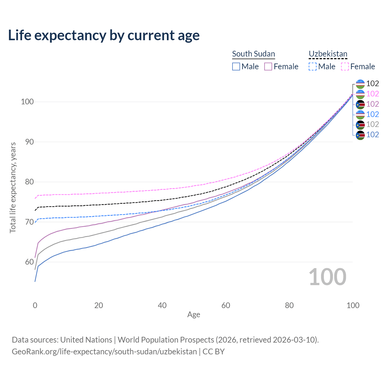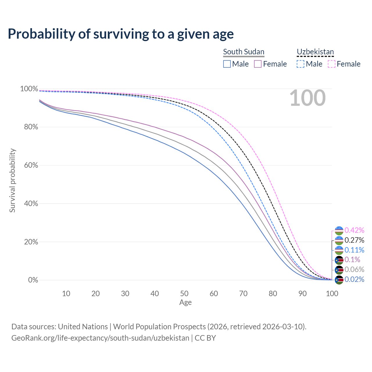 This life expectancy calculator shows the odds of living to 100, 95, 90, and below based on current age for both males and females in South Sudan and Uzbekistan, along with mean and median age of death. The calculations are based on the 2026 life tables (actuarial tables) from the UN World Population Prospects.