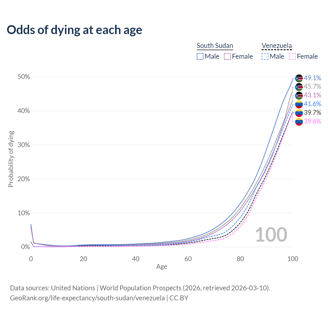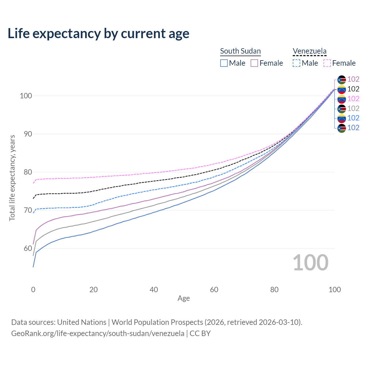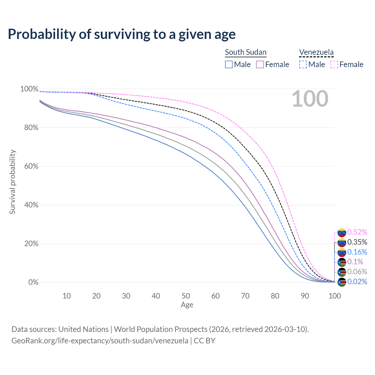 This life expectancy calculator shows the odds of living to 100, 95, 90, and below based on current age for both males and females in South Sudan and Venezuela, along with mean and median age of death. The calculations are based on the 2026 life tables (actuarial tables) from the UN World Population Prospects.