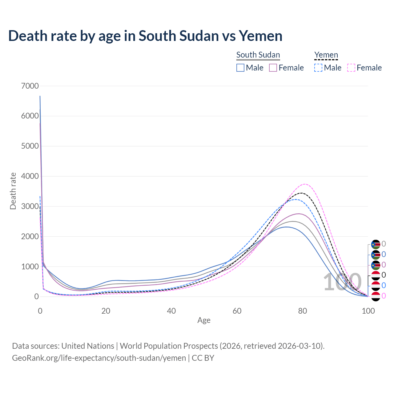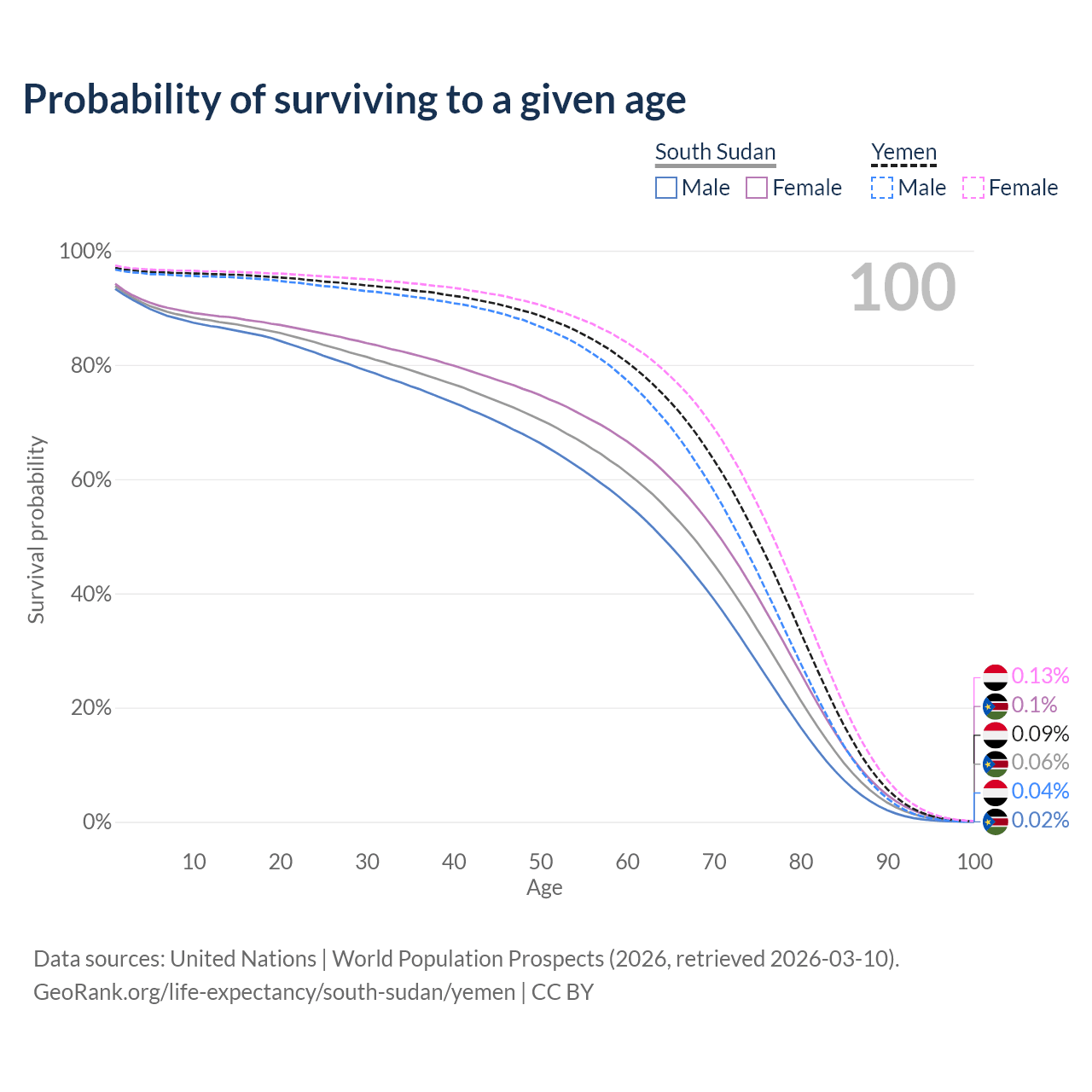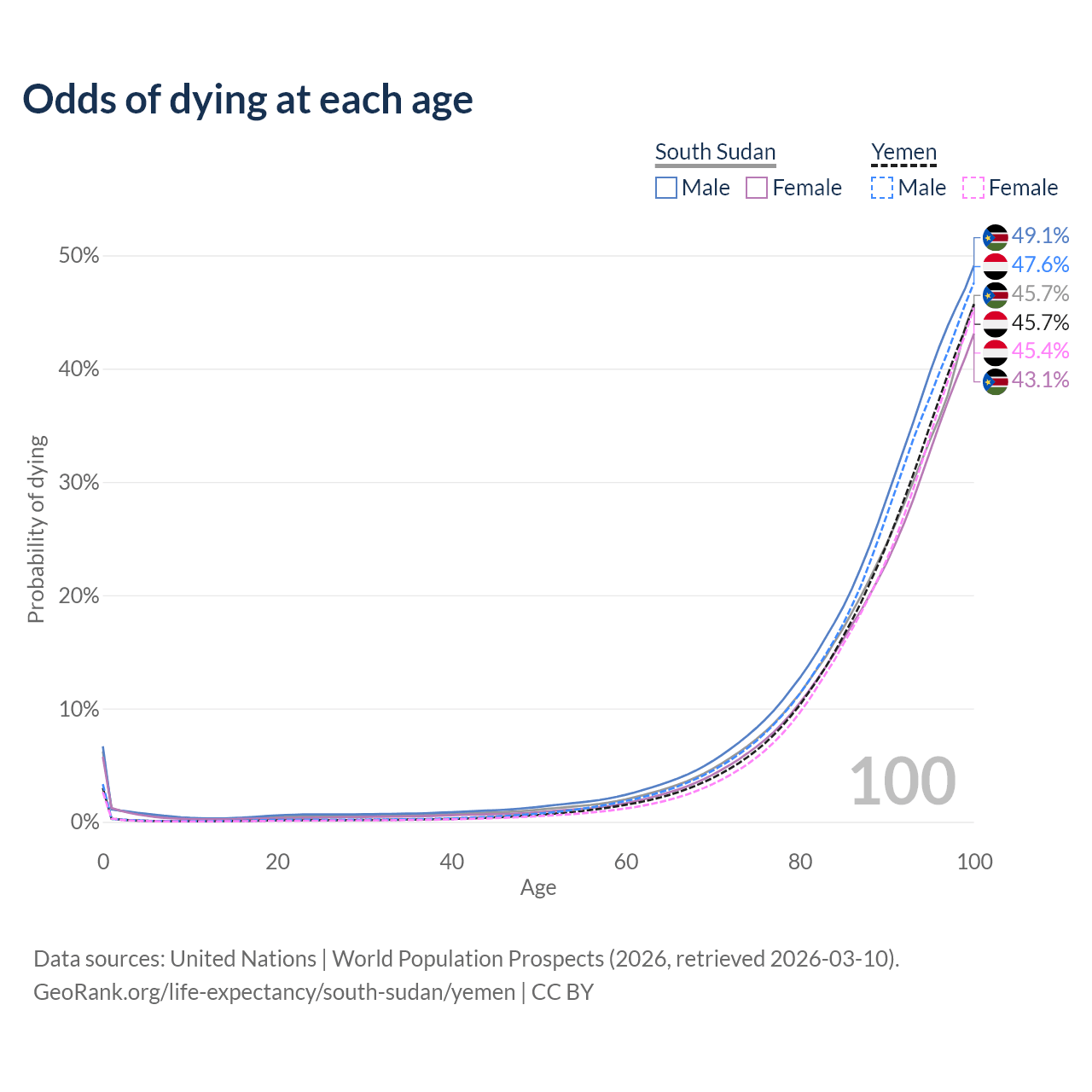 This life expectancy calculator shows the odds of living to 100, 95, 90, and below based on current age for both males and females in South Sudan and Yemen, along with mean and median age of death. The calculations are based on the 2026 life tables (actuarial tables) from the UN World Population Prospects.