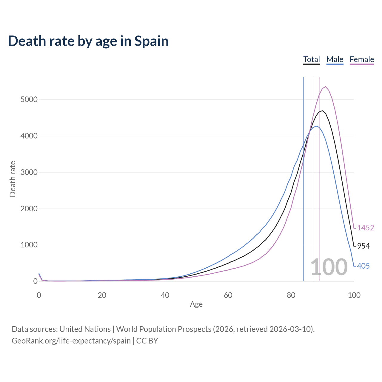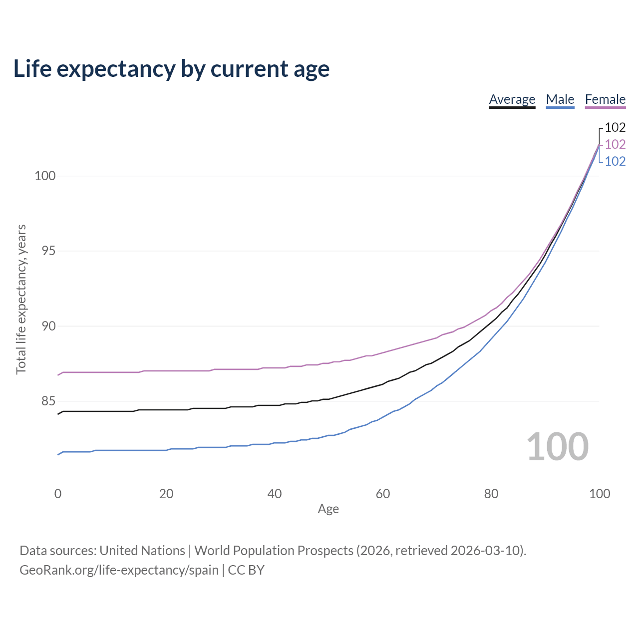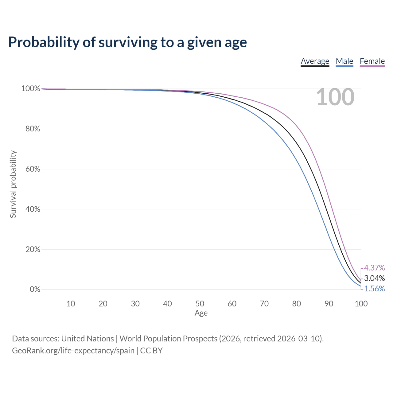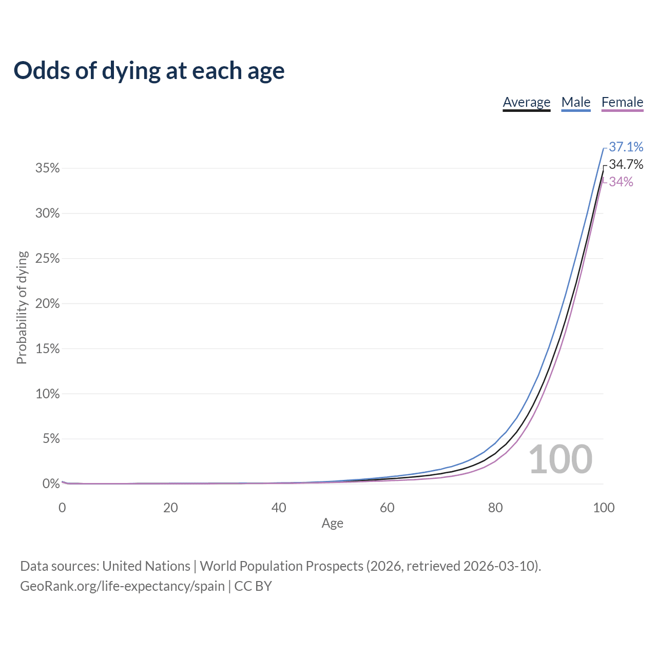This life expectancy calculator shows the odds of living to 100, 95, 90, and below based on current age for both males and females in Spain, along with mean and median age of death. The calculations are based on the 2026 life tables (actuarial tables) from the UN World Population Prospects.