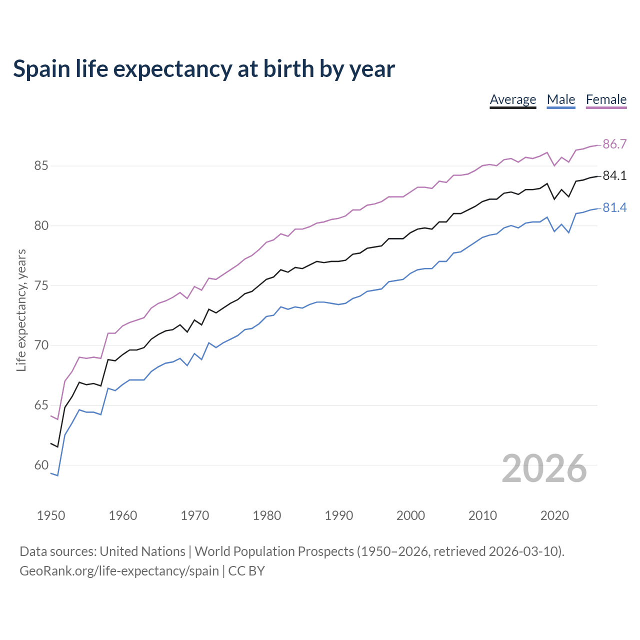 Spain ranks 10/197 for average life expectancy at birth, with 81.4 years for males, 86.7 years for females, and 84.1 years for both sexes combined.