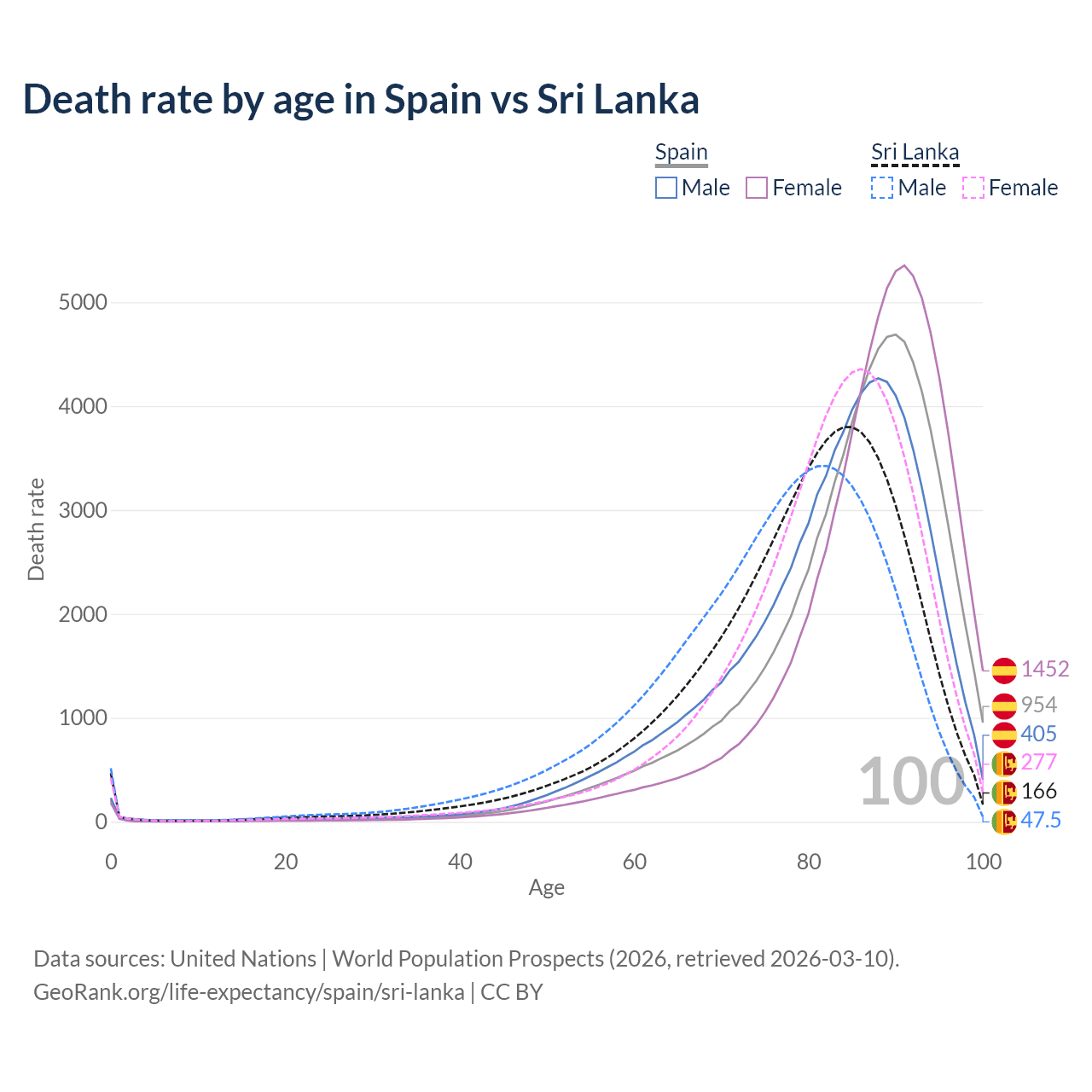 In Spain, the most common age of death is 90, compared to 85 in Sri Lanka. The median age of death is 87 in Spain and 81 in Sri Lanka, meaning only half of each cohort is expected to live past that age.