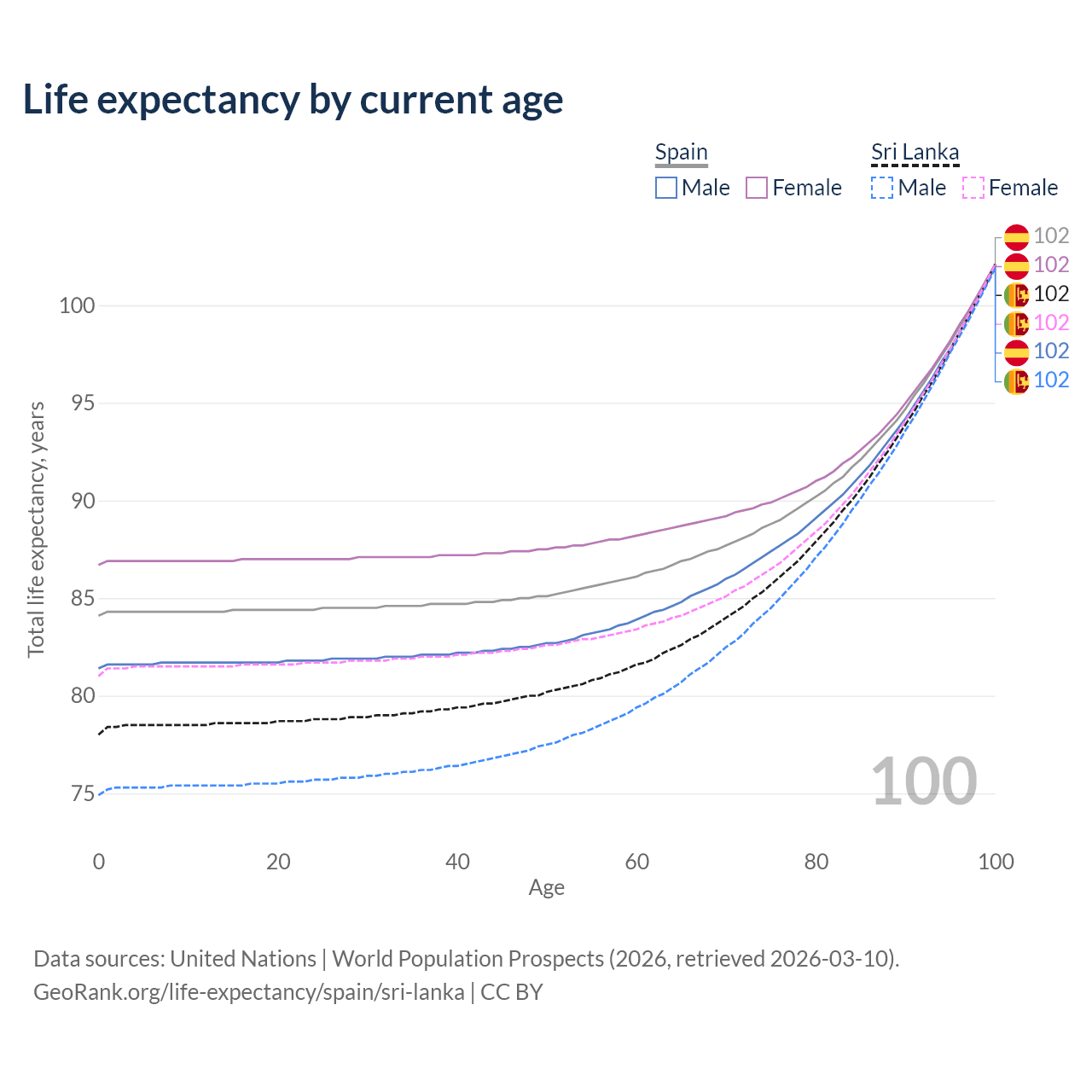 The average life expectancy at birth is 84.1 years in Spain vs 78 in Sri Lanka. Spain is ranked 10/197 by life expectancy, and Sri Lanka is 64/197. In Spain, the life expectancy is 81.4 years for males and 86.7 years for females. In Sri Lanka, it's 74.9 years for males and 81 years for females.