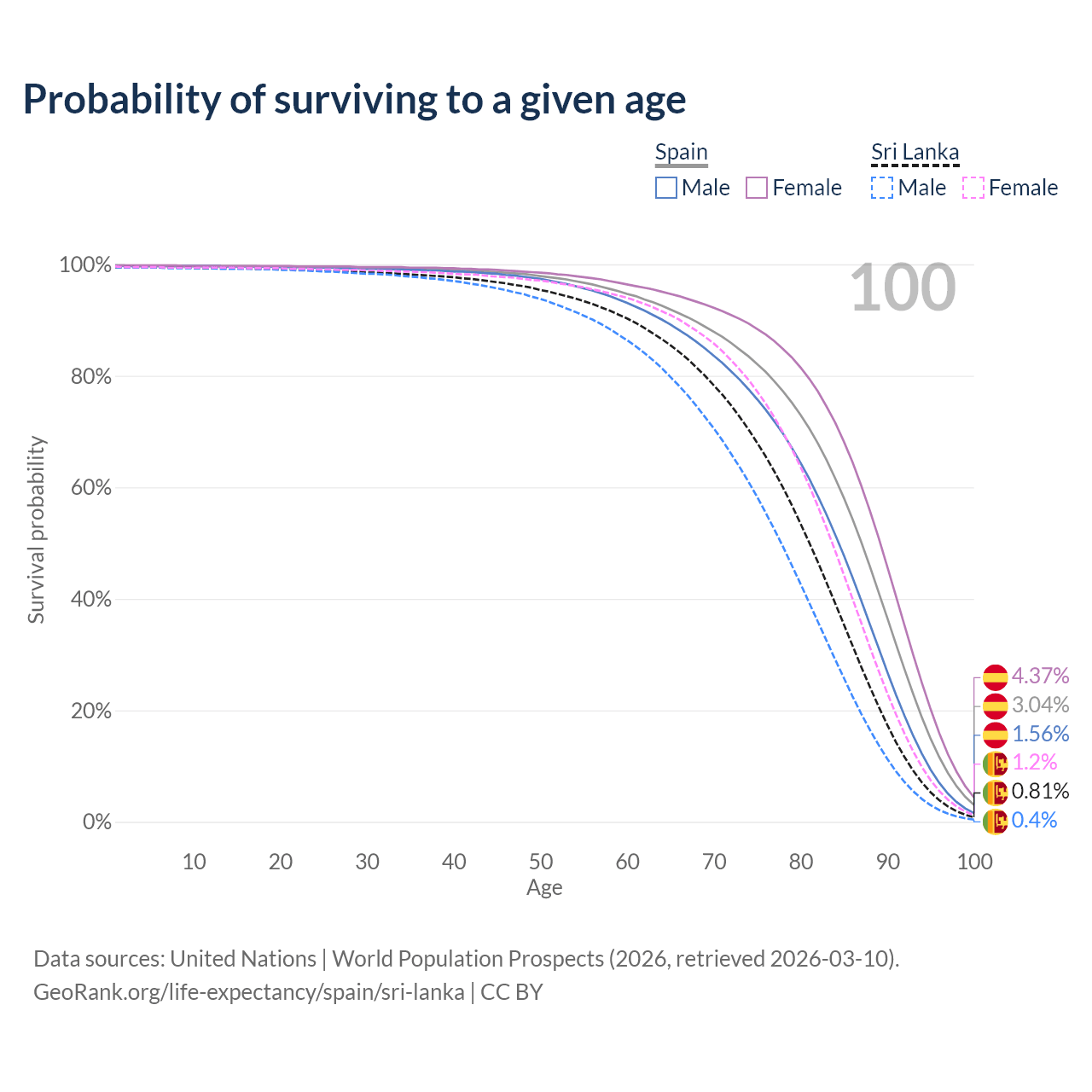 This life expectancy calculator shows the odds of living to 100, 95, 90, and below based on current age for both males and females in Spain and Sri Lanka, along with mean and median age of death. The calculations are based on the 2026 life tables (actuarial tables) from the UN World Population Prospects.