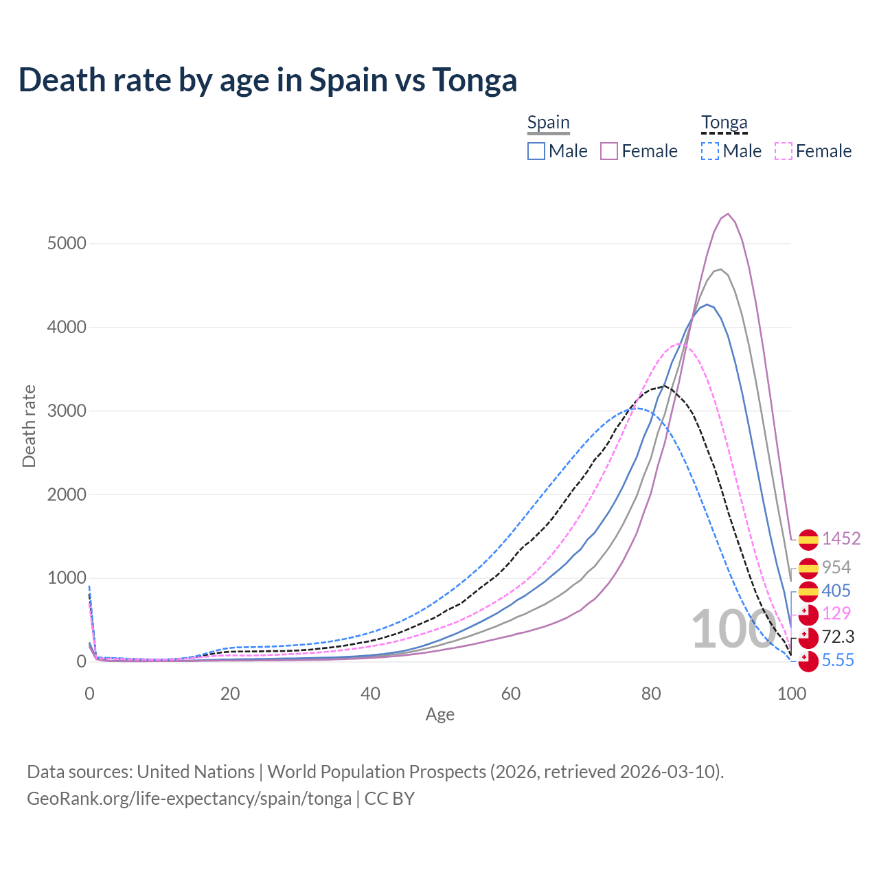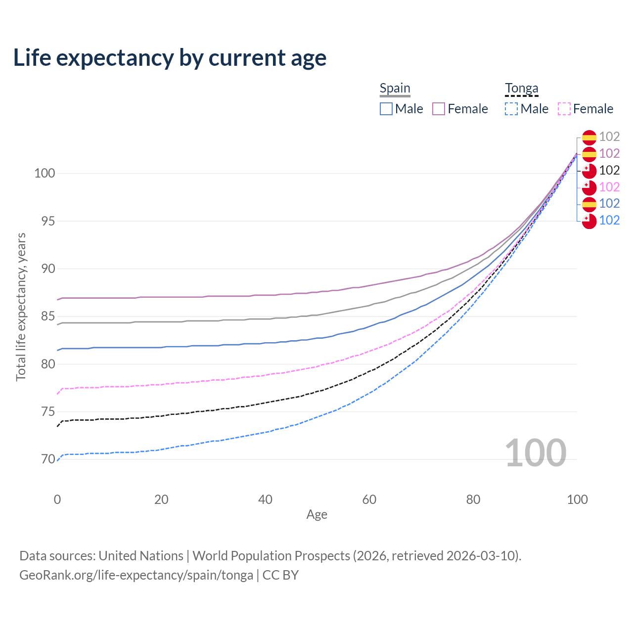 This life expectancy calculator shows the odds of living to 100, 95, 90, and below based on current age for both males and females in Spain and Tonga, along with mean and median age of death. The calculations are based on the 2026 life tables (actuarial tables) from the UN World Population Prospects.