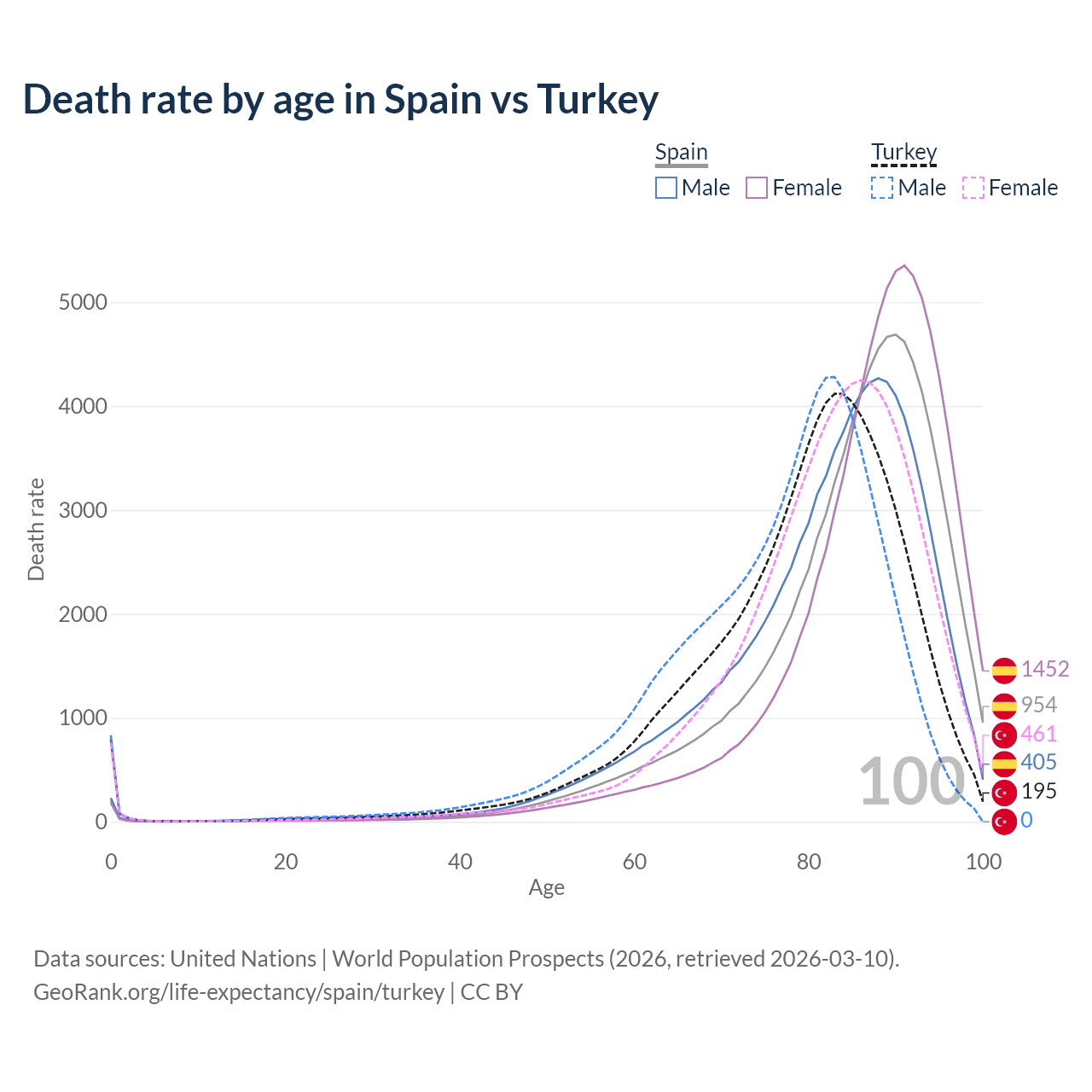 In Spain, the most common age of death is 90, compared to 83 in Turkey. The median age of death is 87 in Spain and 81.4 in Turkey, meaning only half of each cohort is expected to live past that age.