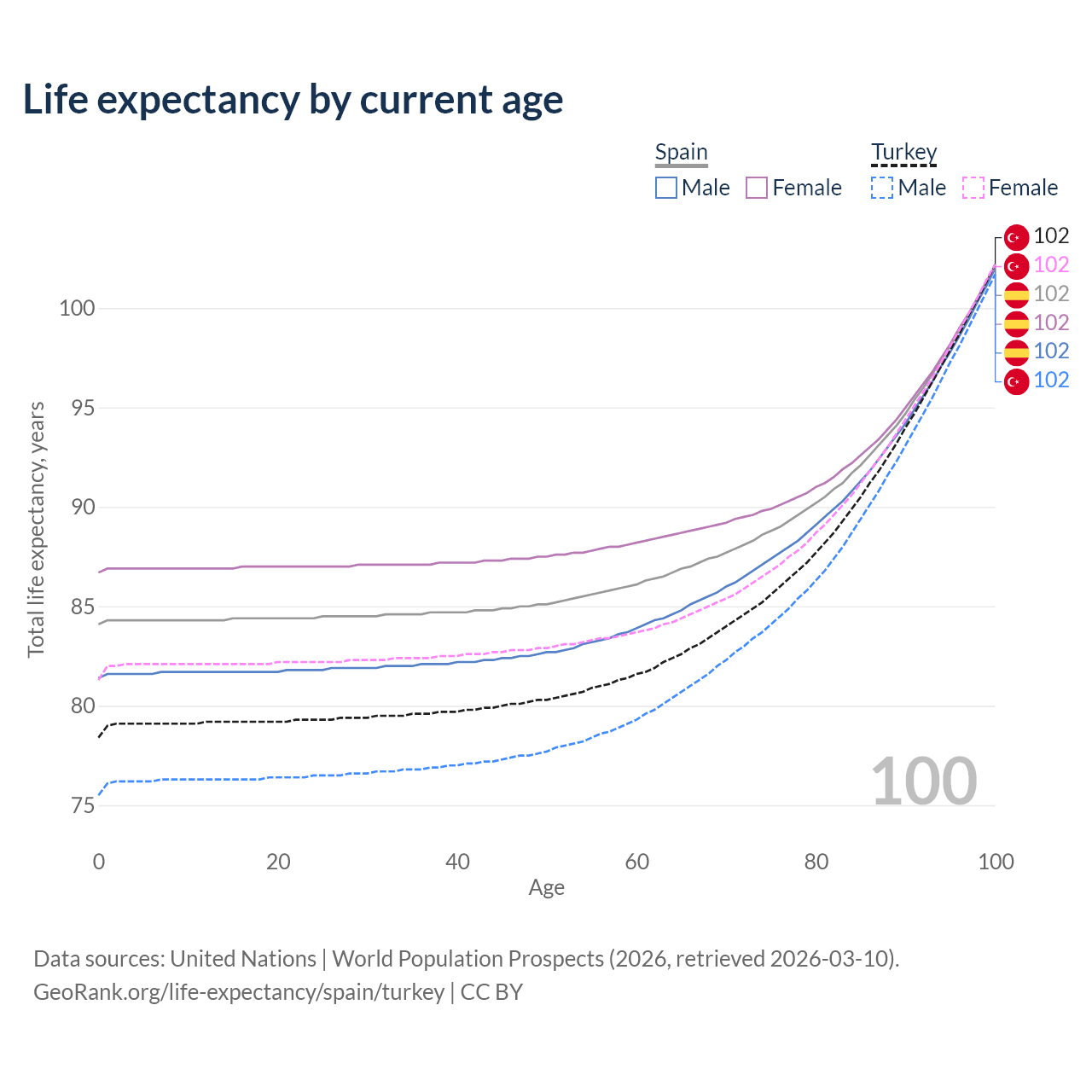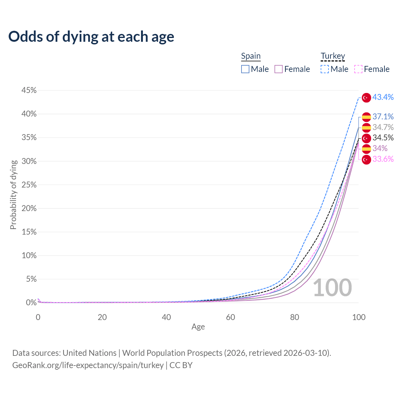 This life expectancy calculator shows the odds of living to 100, 95, 90, and below based on current age for both males and females in Spain and Turkey, along with mean and median age of death. The calculations are based on the 2026 life tables (actuarial tables) from the UN World Population Prospects.