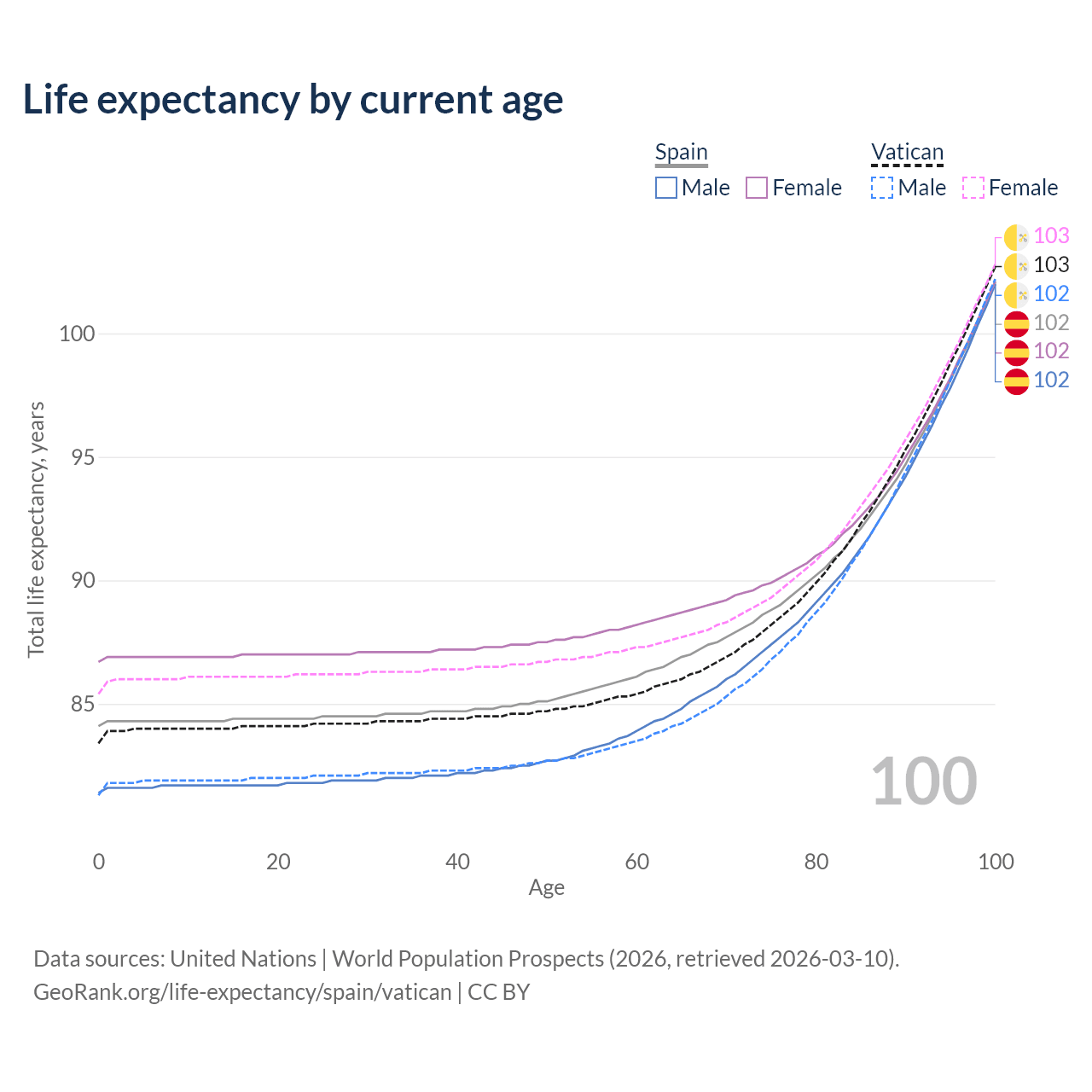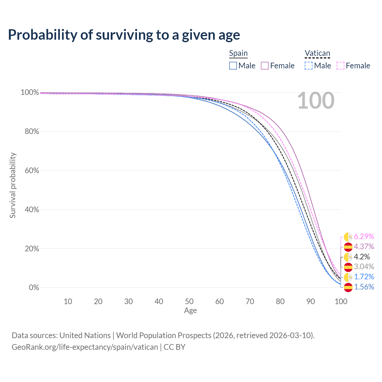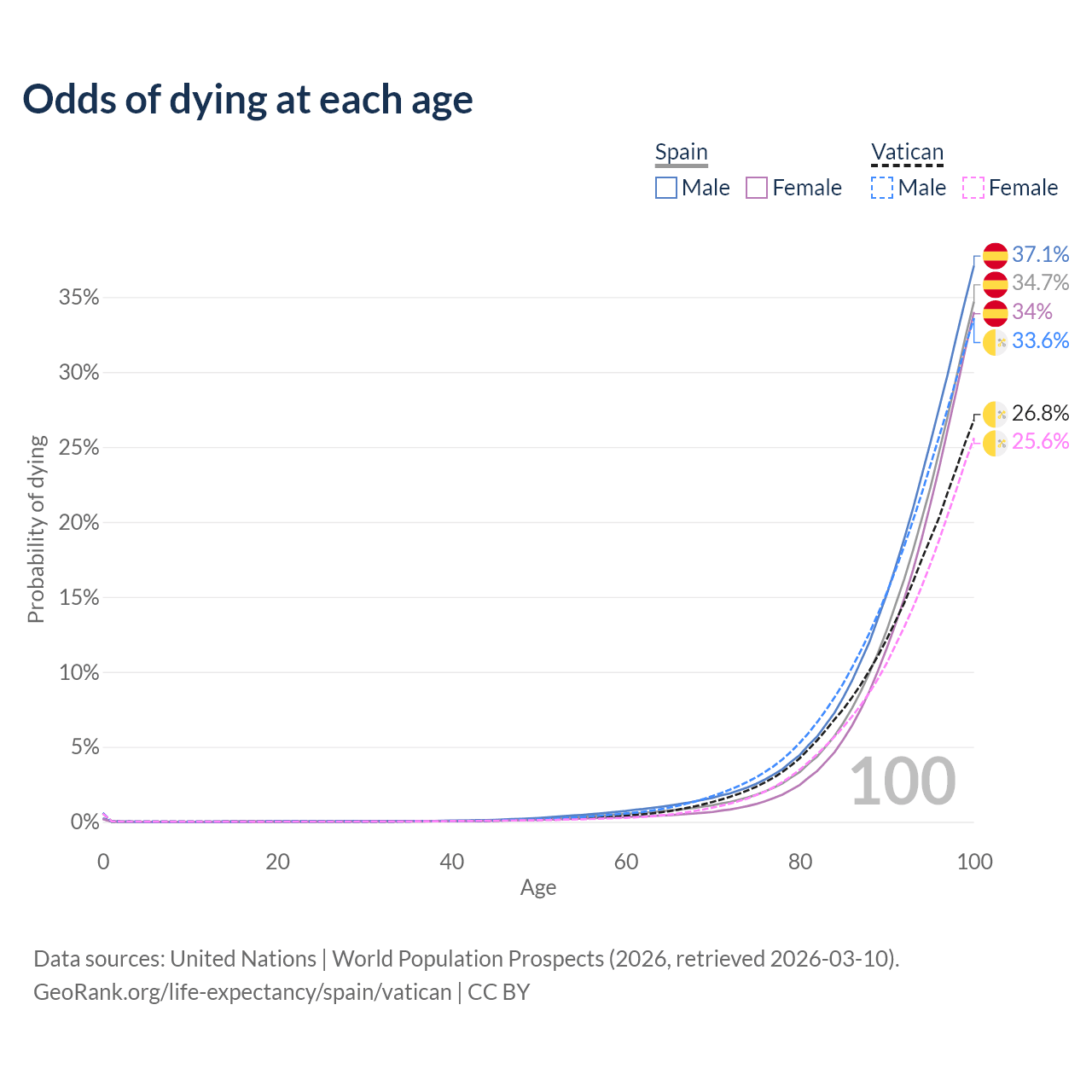 This life expectancy calculator shows the odds of living to 100, 95, 90, and below based on current age for both males and females in Spain and the Vatican, along with mean and median age of death. The calculations are based on the 2026 life tables (actuarial tables) from the UN World Population Prospects.