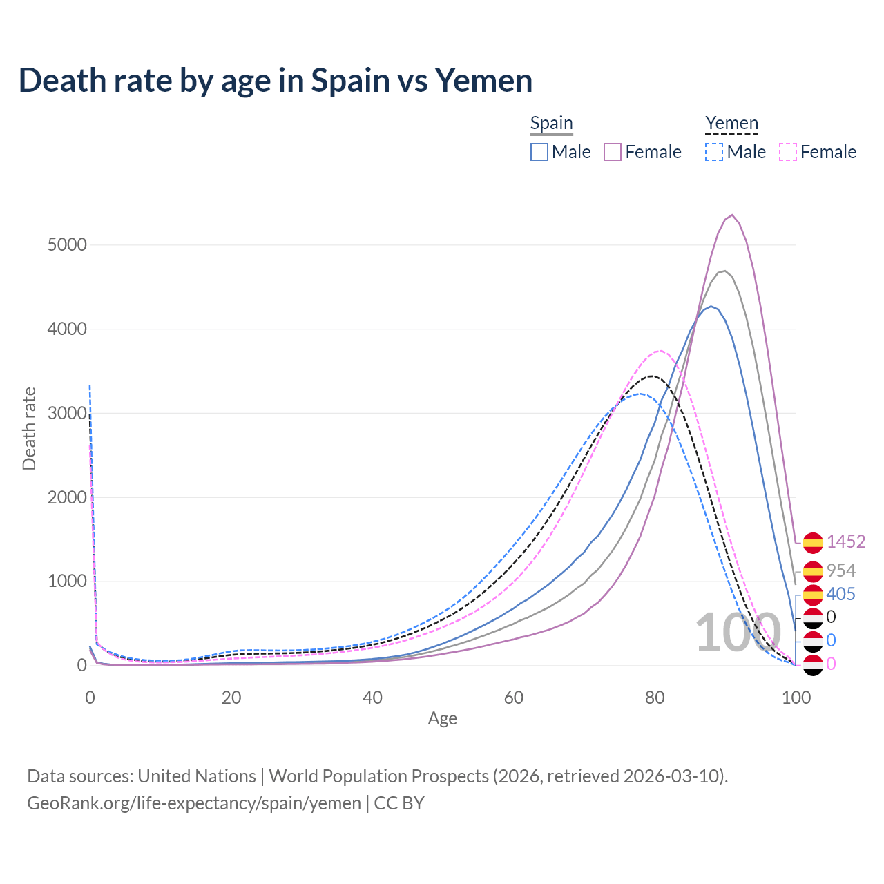 In Spain, the most common age of death is 90, compared to 80 in Yemen. The median age of death is 87 in Spain and 74.9 in Yemen, meaning only half of each cohort is expected to live past that age.