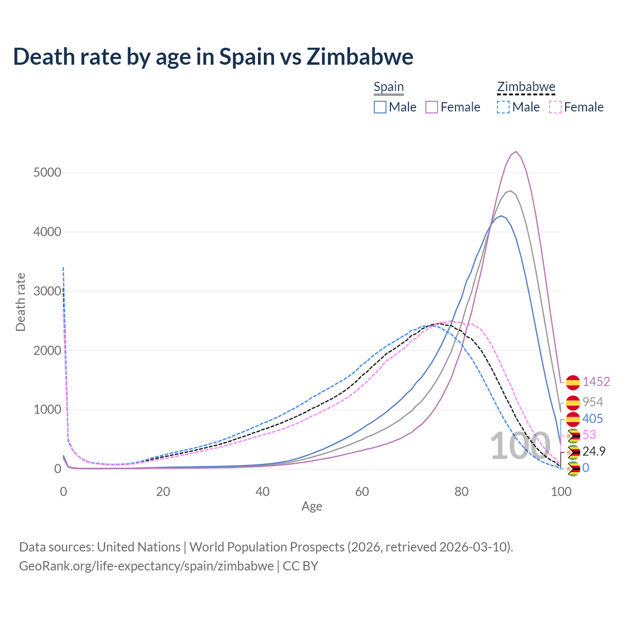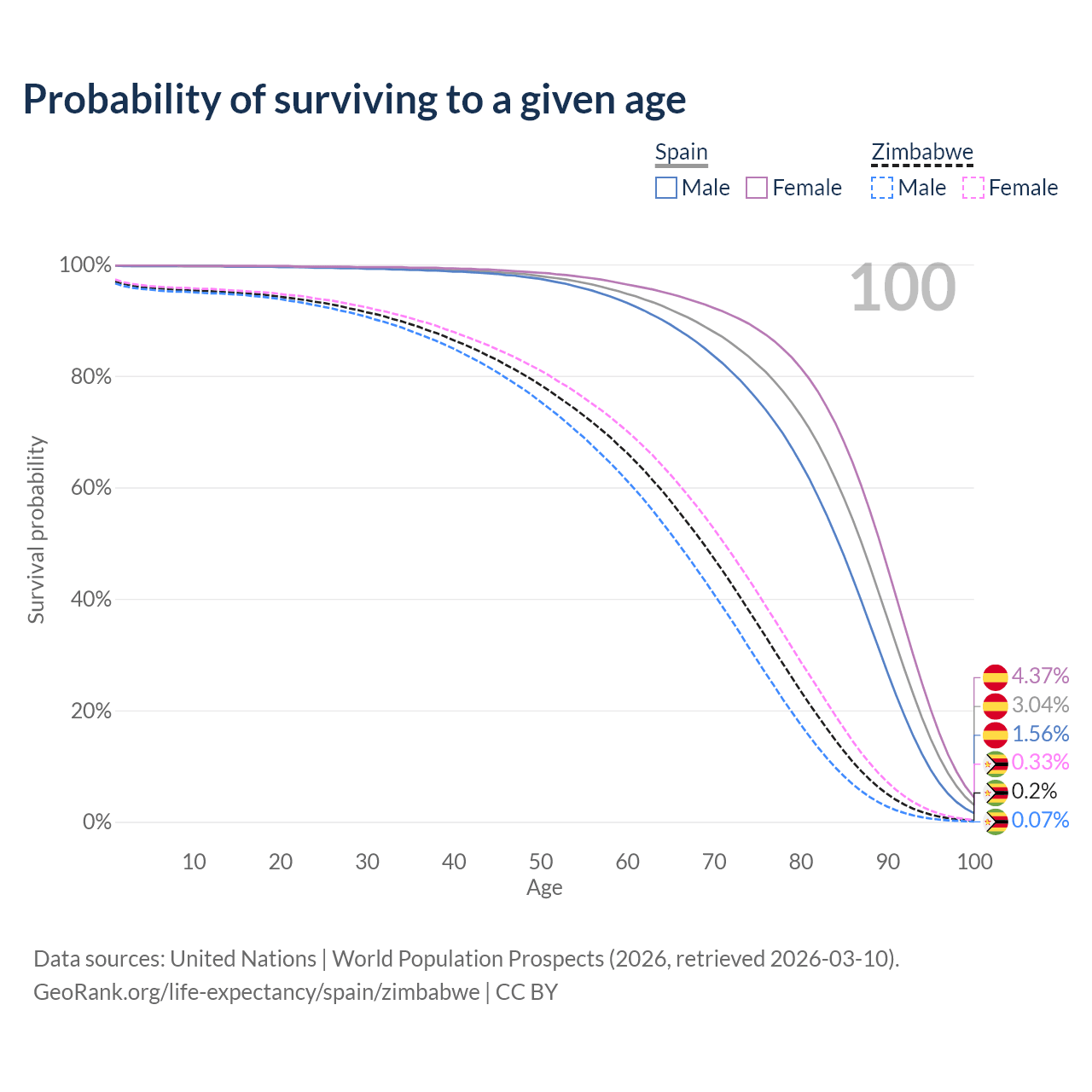 This life expectancy calculator shows the odds of living to 100, 95, 90, and below based on current age for both males and females in Spain and Zimbabwe, along with mean and median age of death. The calculations are based on the 2026 life tables (actuarial tables) from the UN World Population Prospects.
