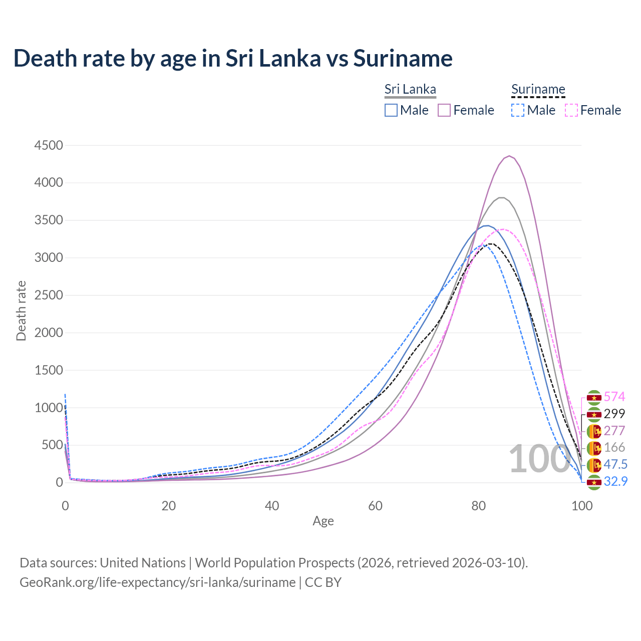 This life expectancy calculator shows the odds of living to 100, 95, 90, and below based on current age for both males and females in Sri Lanka and Suriname, along with mean and median age of death. The calculations are based on the 2026 life tables (actuarial tables) from the UN World Population Prospects.