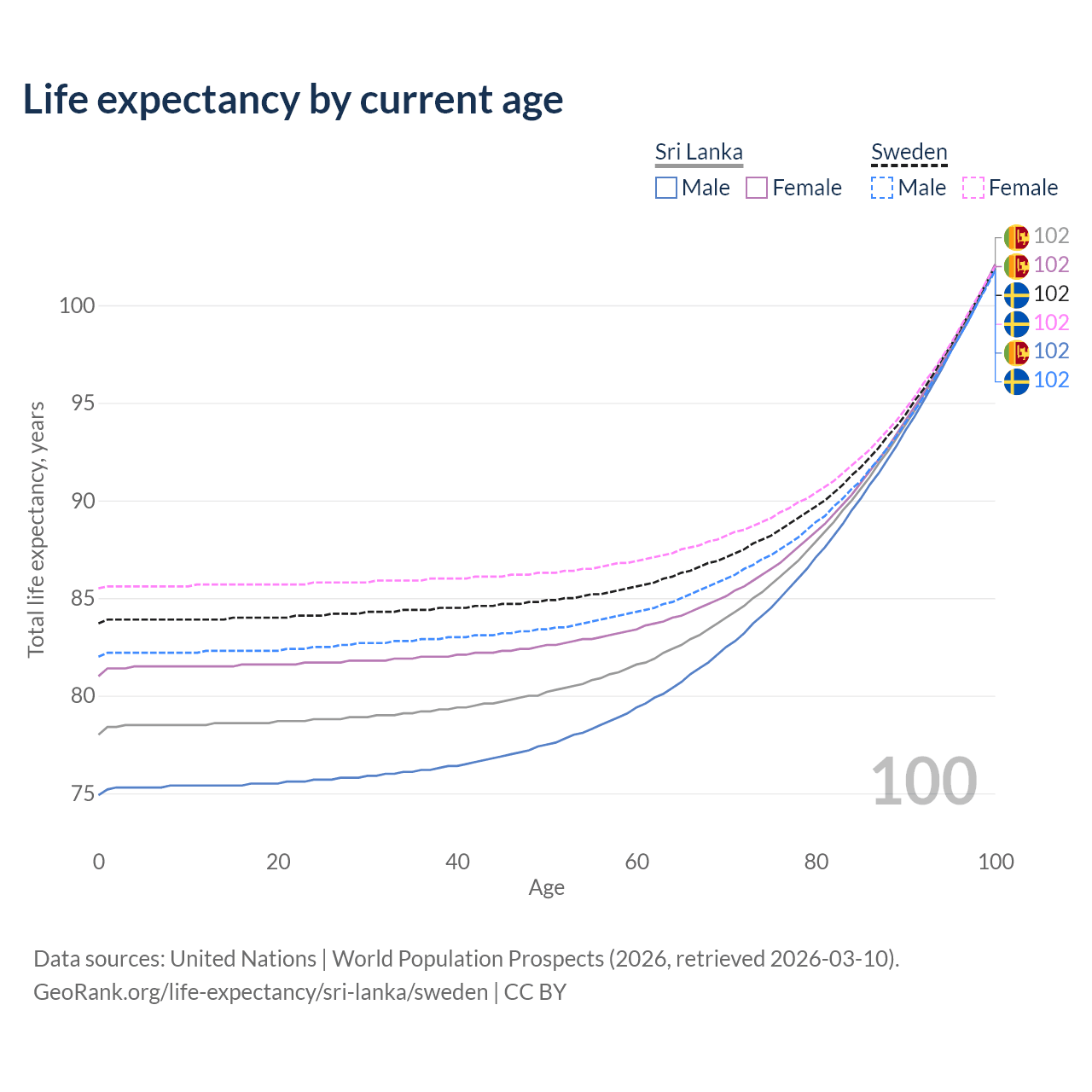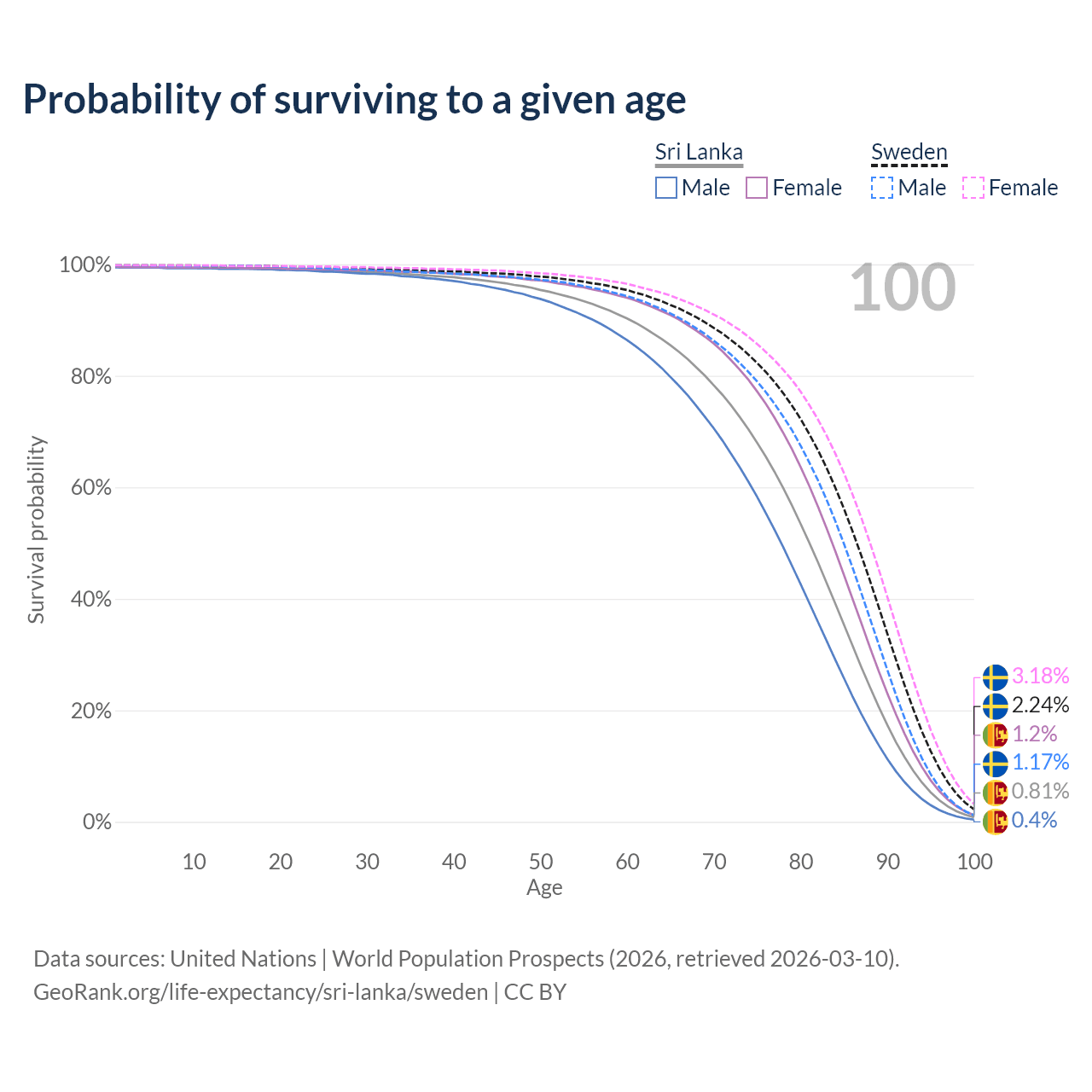 This life expectancy calculator shows the odds of living to 100, 95, 90, and below based on current age for both males and females in Sri Lanka and Sweden, along with mean and median age of death. The calculations are based on the 2026 life tables (actuarial tables) from the UN World Population Prospects.