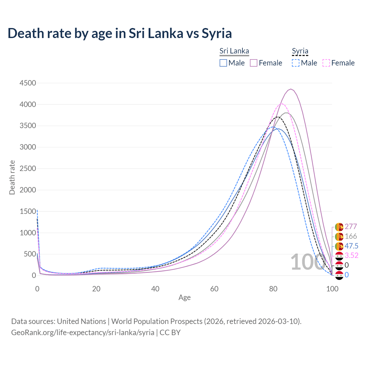 This life expectancy calculator shows the odds of living to 100, 95, 90, and below based on current age for both males and females in Sri Lanka and Syria, along with mean and median age of death. The calculations are based on the 2026 life tables (actuarial tables) from the UN World Population Prospects.