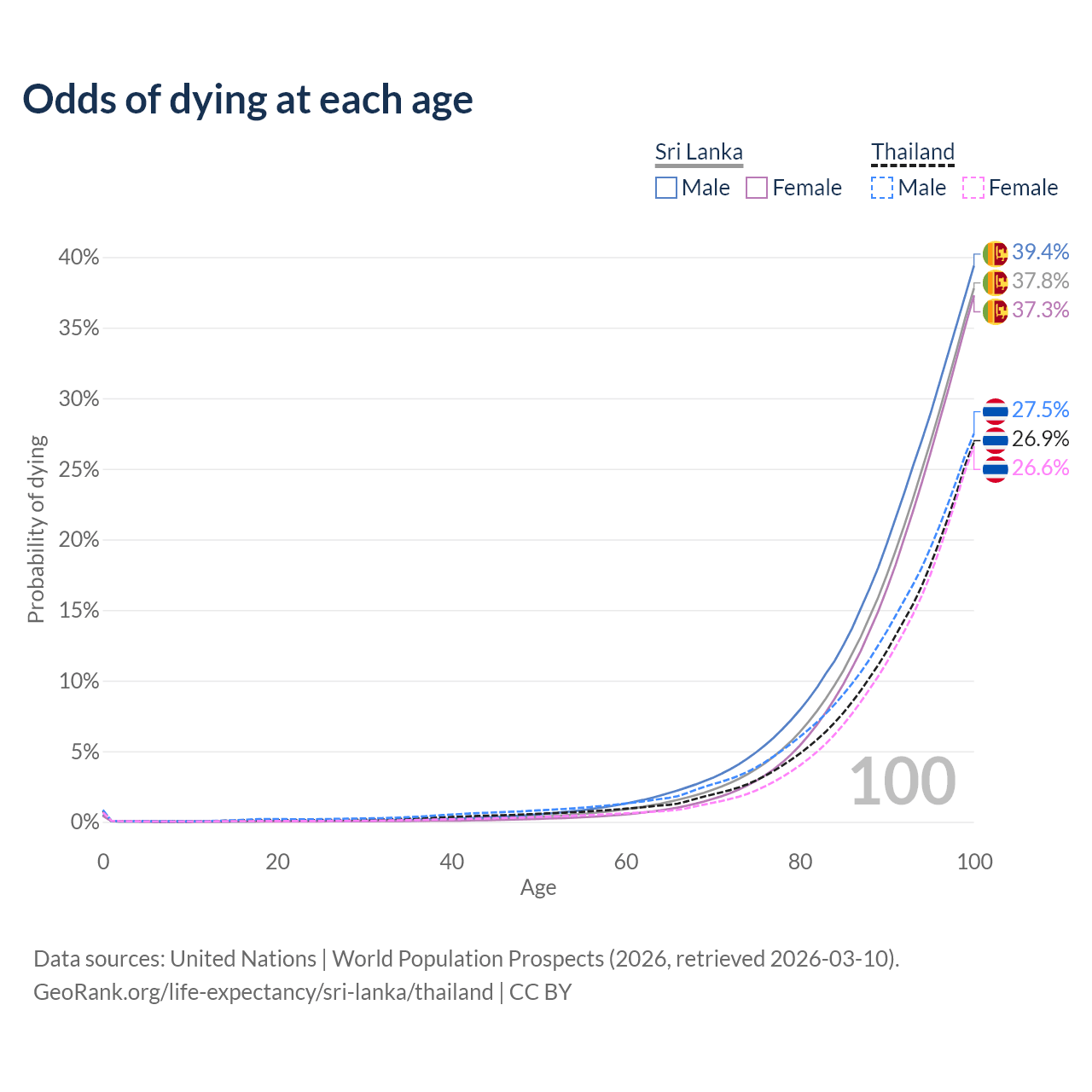 This life expectancy calculator shows the odds of living to 100, 95, 90, and below based on current age for both males and females in Sri Lanka and Thailand, along with mean and median age of death. The calculations are based on the 2026 life tables (actuarial tables) from the UN World Population Prospects.
