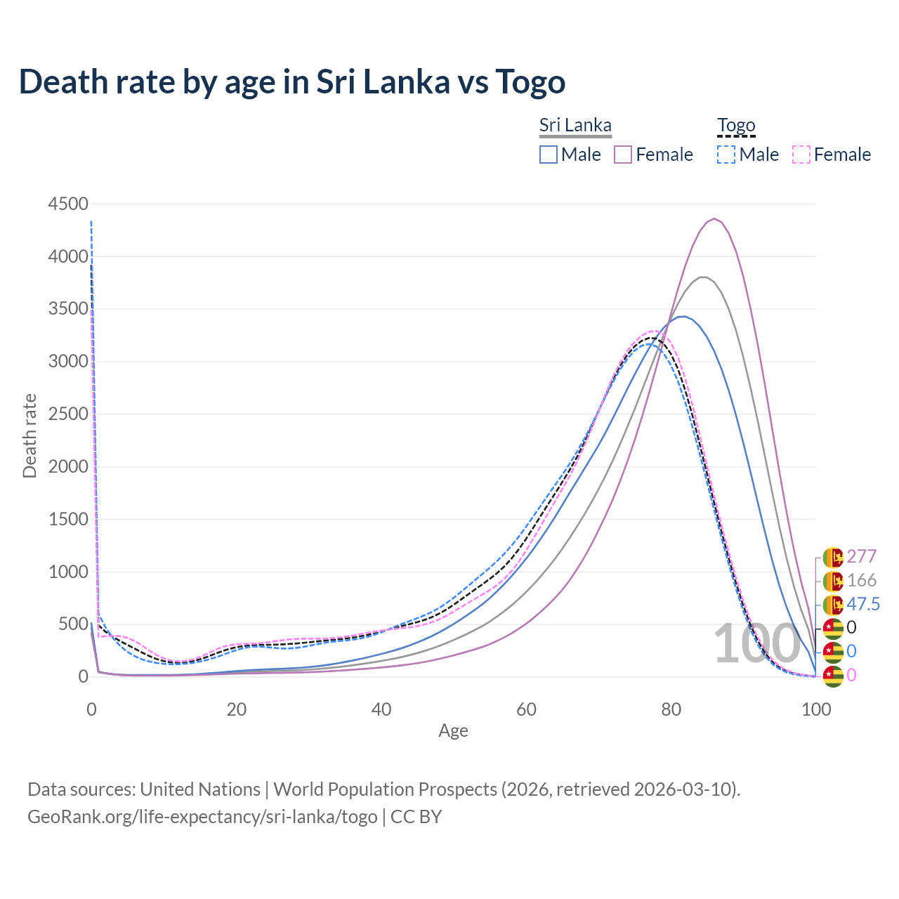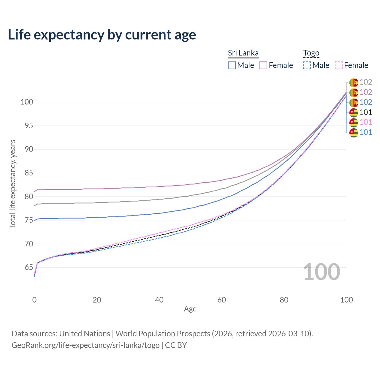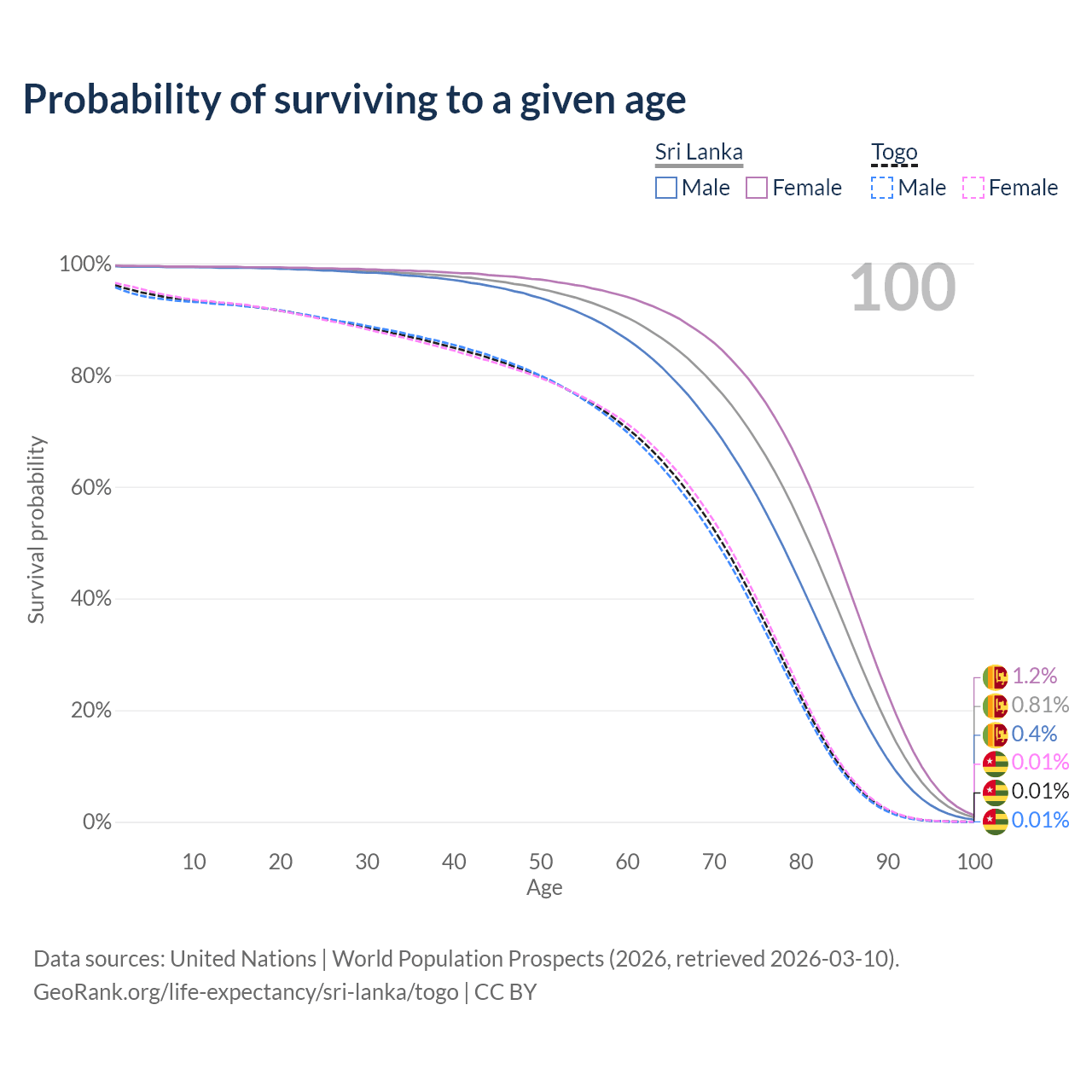 This life expectancy calculator shows the odds of living to 100, 95, 90, and below based on current age for both males and females in Sri Lanka and Togo, along with mean and median age of death. The calculations are based on the 2026 life tables (actuarial tables) from the UN World Population Prospects.