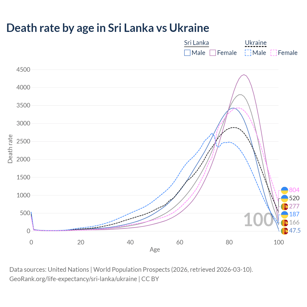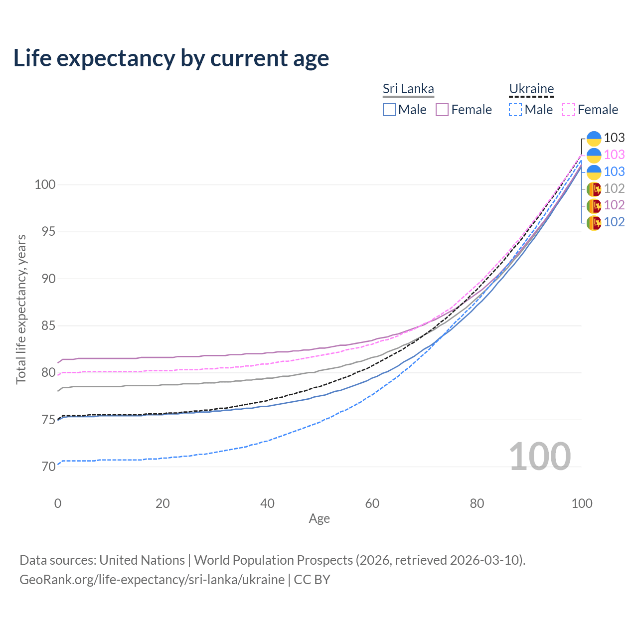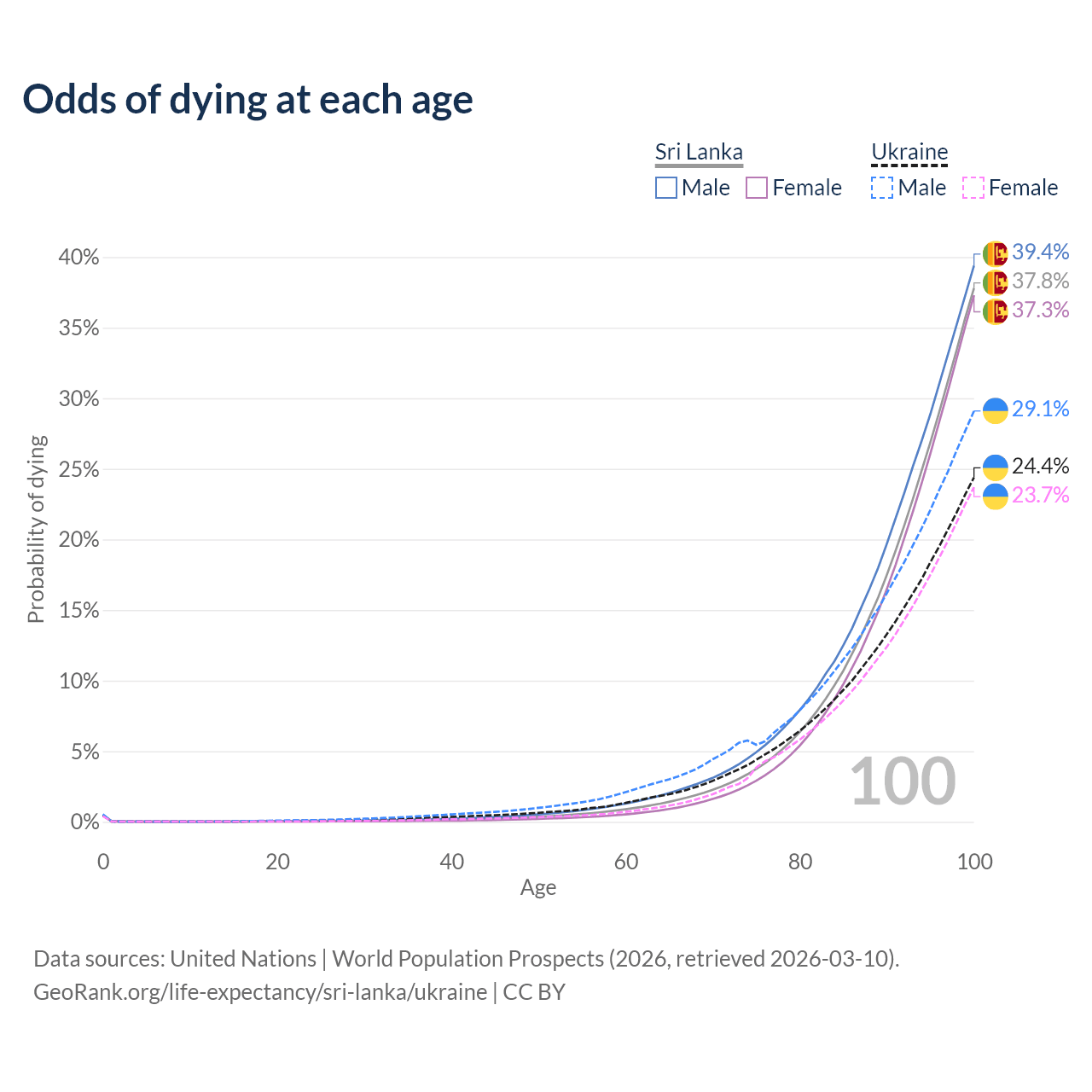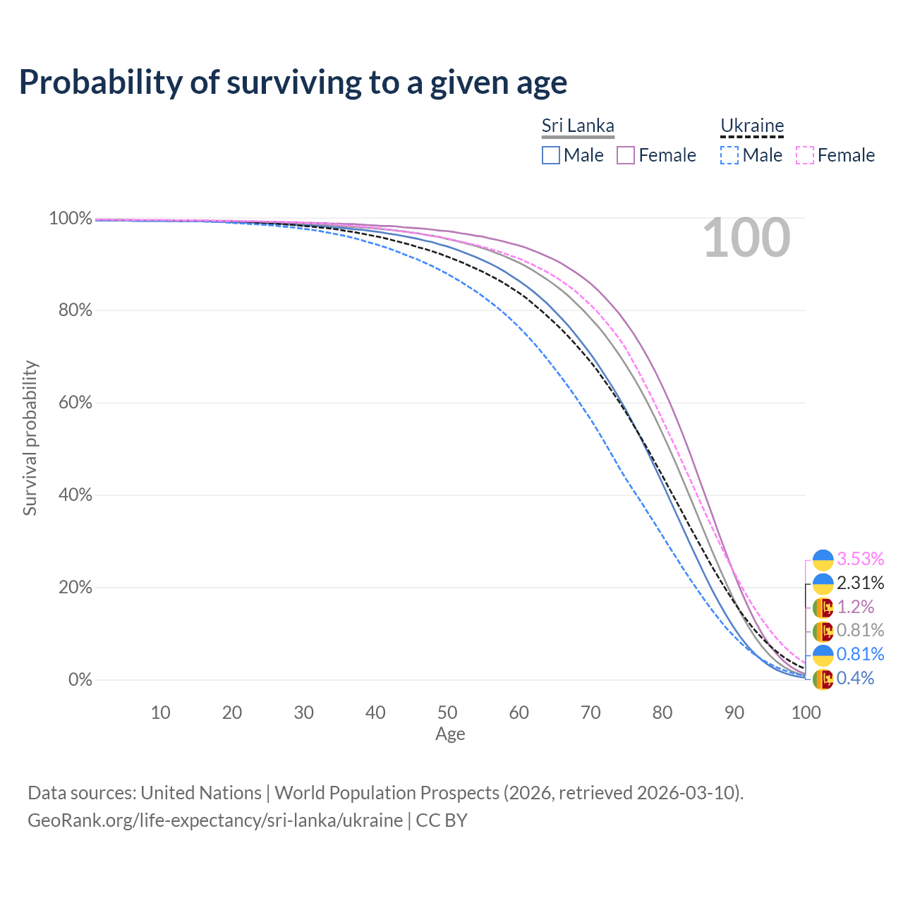 This life expectancy calculator shows the odds of living to 100, 95, 90, and below based on current age for both males and females in Sri Lanka and Ukraine, along with mean and median age of death. The calculations are based on the 2026 life tables (actuarial tables) from the UN World Population Prospects.