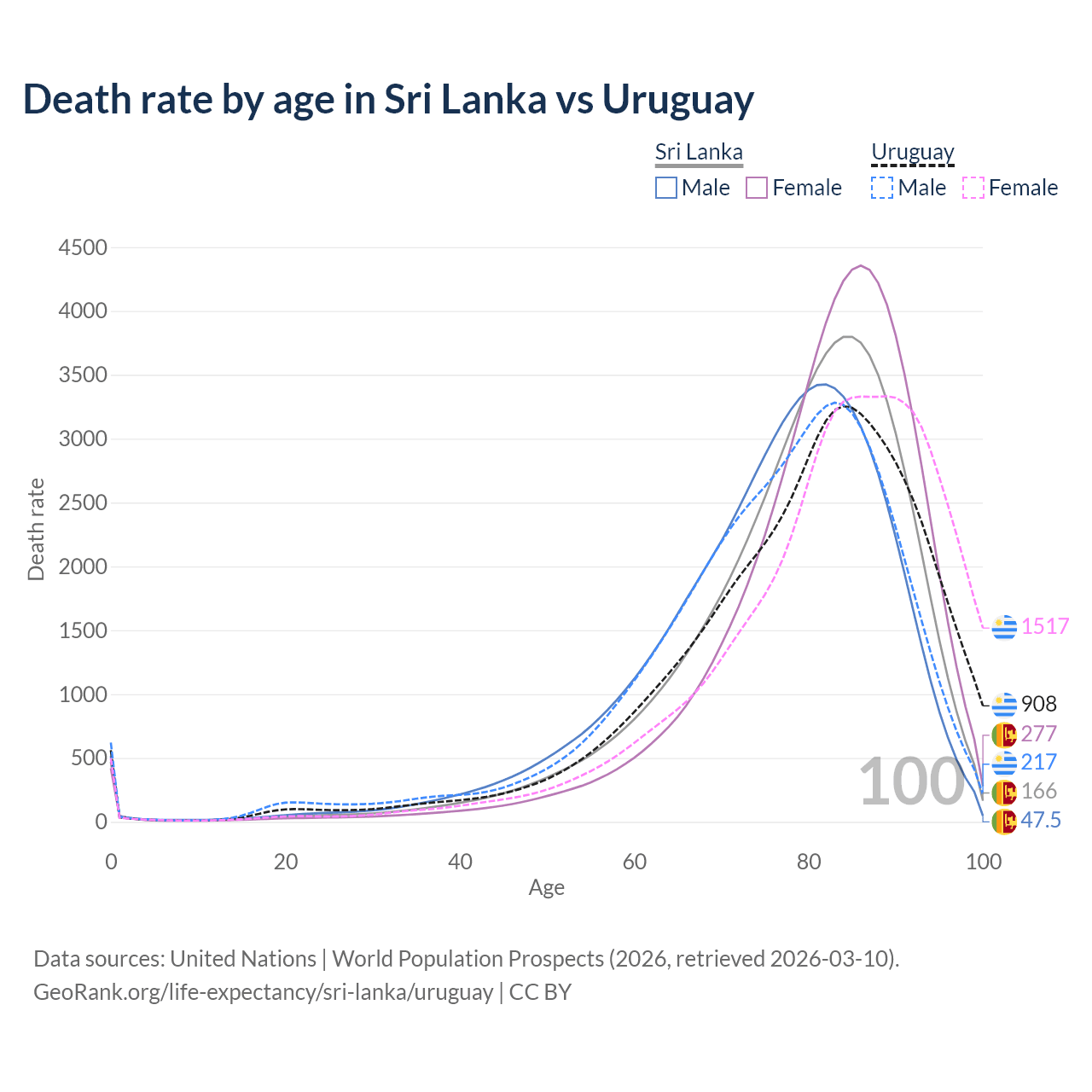 In Sri Lanka, the most common age of death is 85, compared to 84 in Uruguay. The median age of death is 81 in Sri Lanka and 81.8 in Uruguay, meaning only half of each cohort is expected to live past that age.