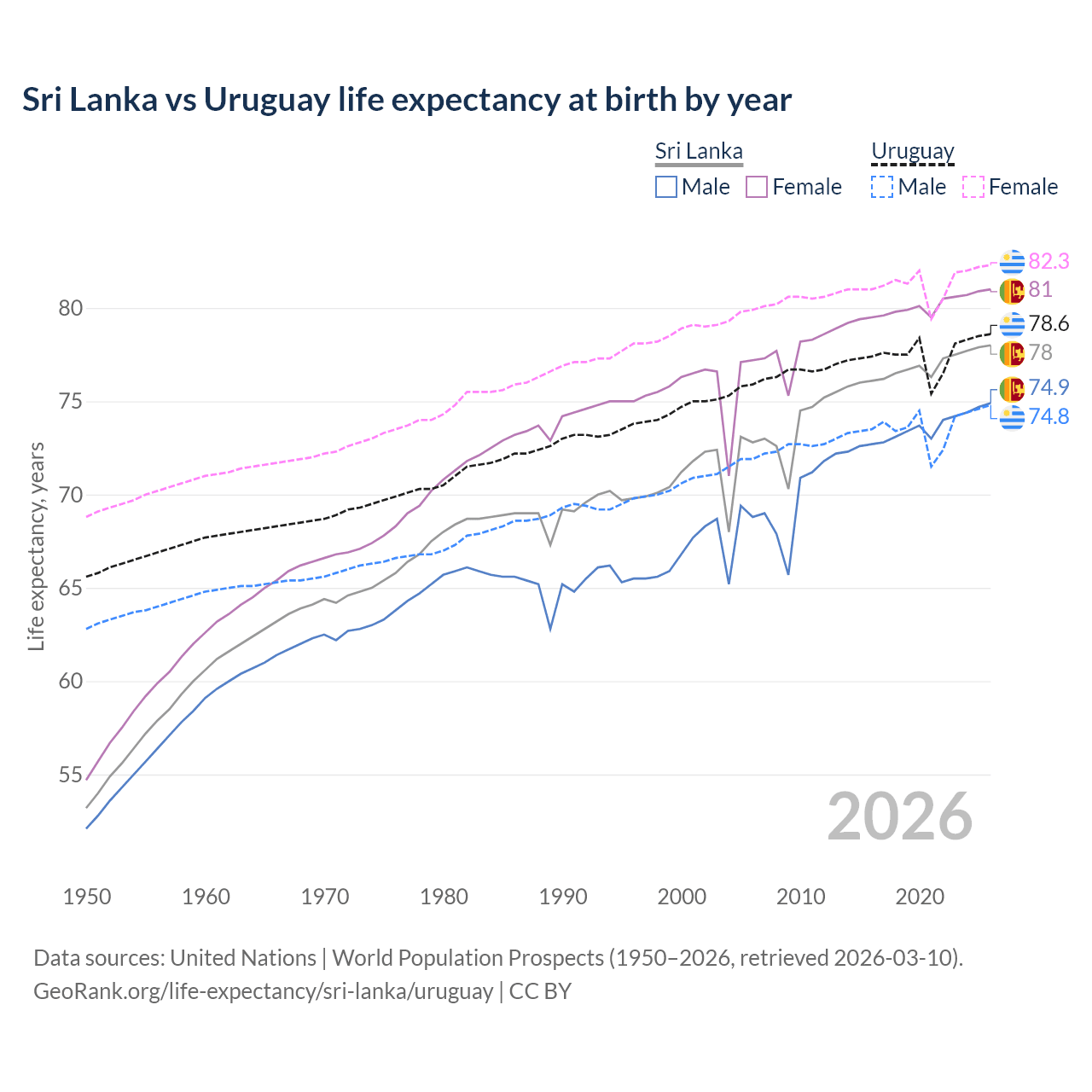 The average life expectancy at birth is 78 years in Sri Lanka vs 78.6 in Uruguay. Sri Lanka is ranked 64/197 by life expectancy, and Uruguay is 55/197. In Sri Lanka, the life expectancy is 74.9 years for males and 81 years for females. In Uruguay, it's 74.8 years for males and 82.3 years for females.