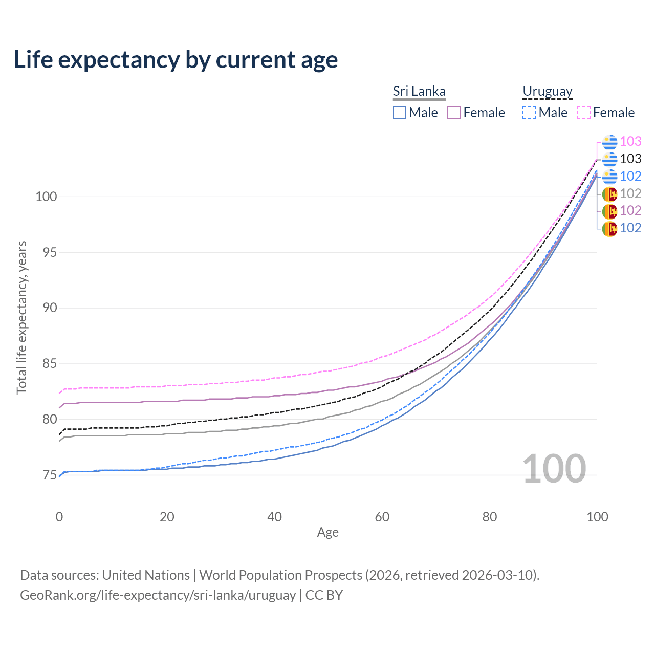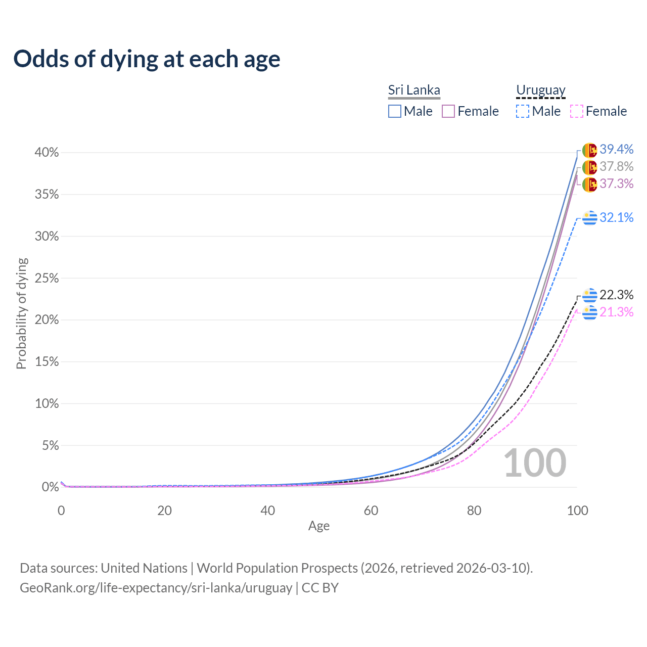This life expectancy calculator shows the odds of living to 100, 95, 90, and below based on current age for both males and females in Sri Lanka and Uruguay, along with mean and median age of death. The calculations are based on the 2026 life tables (actuarial tables) from the UN World Population Prospects.