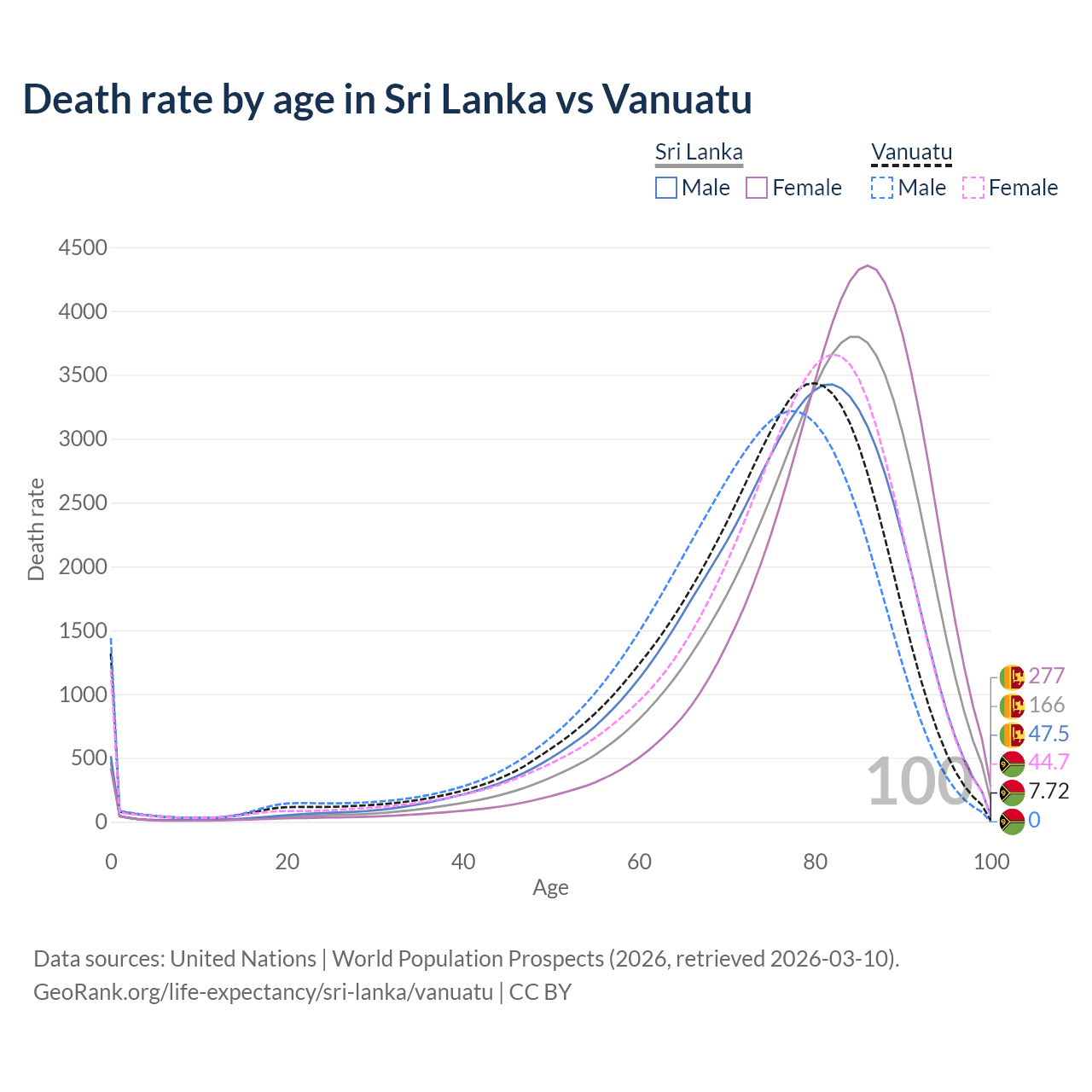 In Sri Lanka, the most common age of death is 85, compared to 80 in Vanuatu. The median age of death is 81 in Sri Lanka and 75.9 in Vanuatu, meaning only half of each cohort is expected to live past that age.