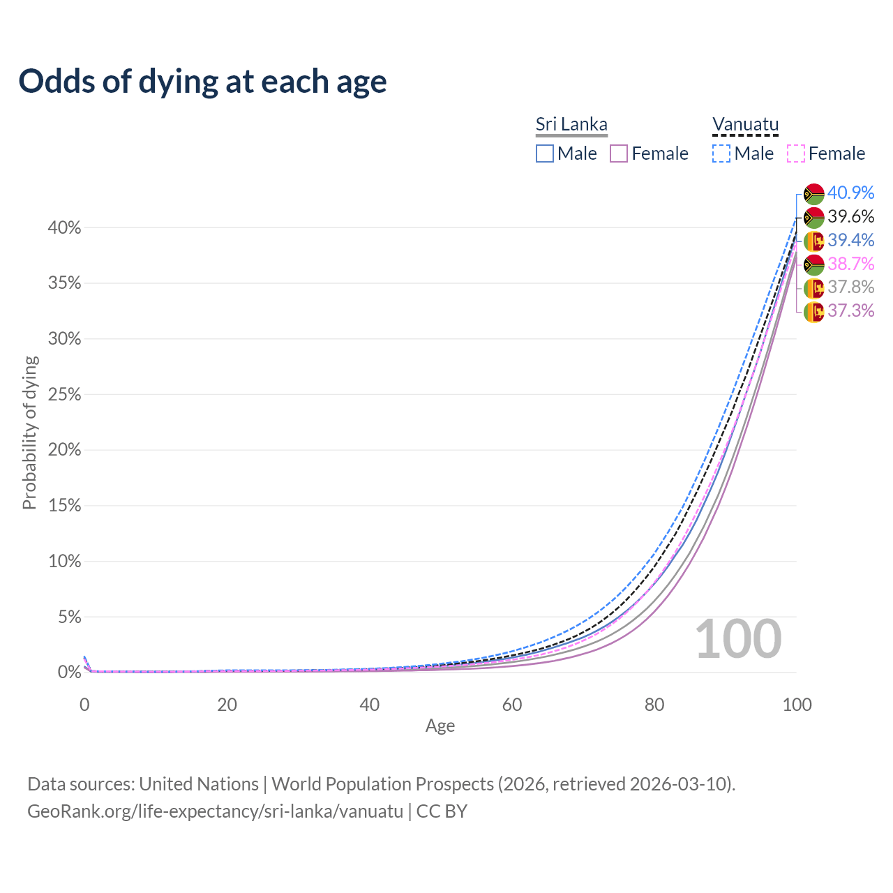 This life expectancy calculator shows the odds of living to 100, 95, 90, and below based on current age for both males and females in Sri Lanka and Vanuatu, along with mean and median age of death. The calculations are based on the 2026 life tables (actuarial tables) from the UN World Population Prospects.