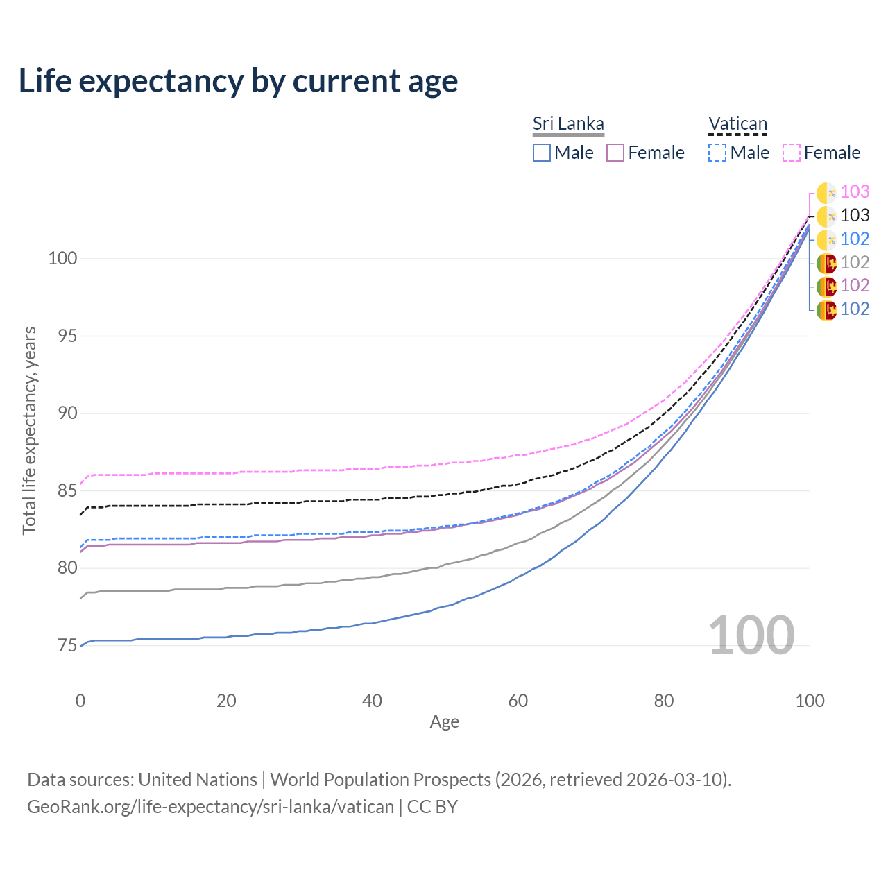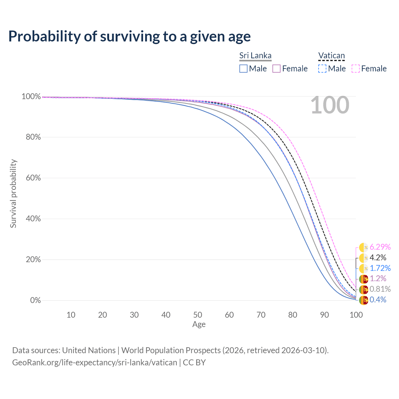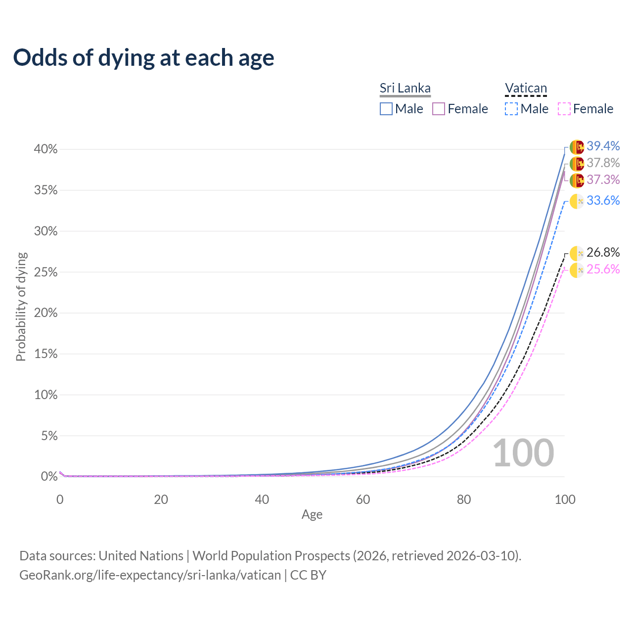This life expectancy calculator shows the odds of living to 100, 95, 90, and below based on current age for both males and females in Sri Lanka and the Vatican, along with mean and median age of death. The calculations are based on the 2026 life tables (actuarial tables) from the UN World Population Prospects.