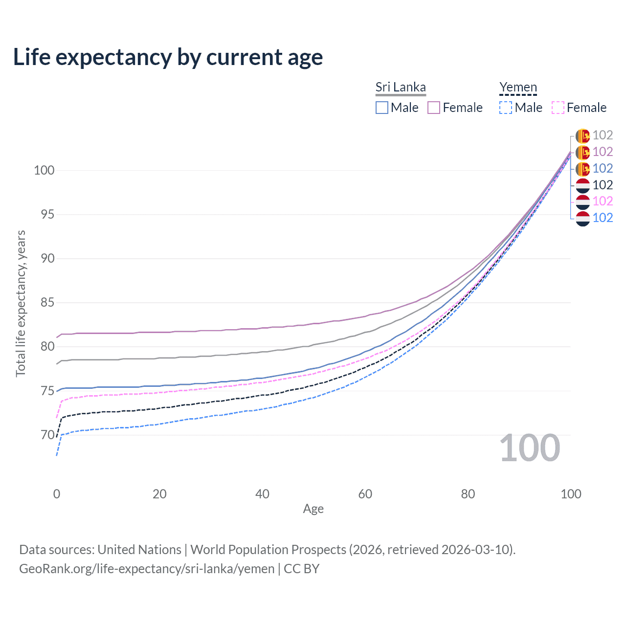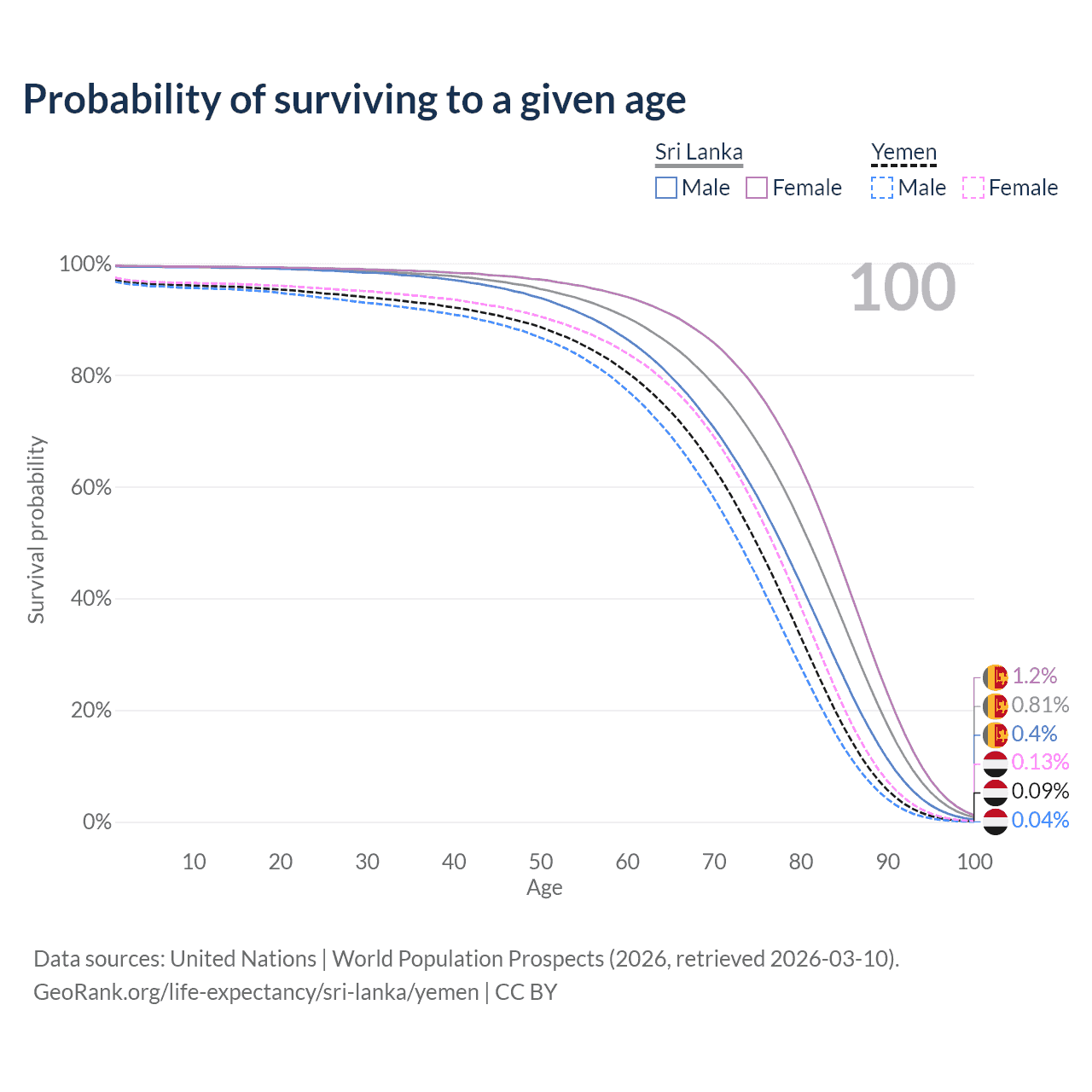 This life expectancy calculator shows the odds of living to 100, 95, 90, and below based on current age for both males and females in Sri Lanka and Yemen, along with mean and median age of death. The calculations are based on the 2026 life tables (actuarial tables) from the UN World Population Prospects.
