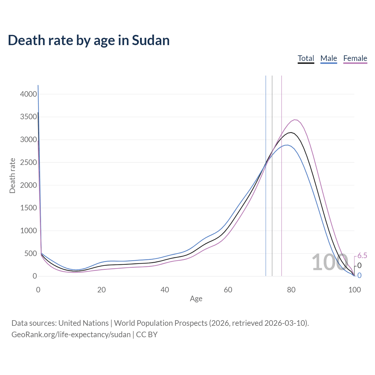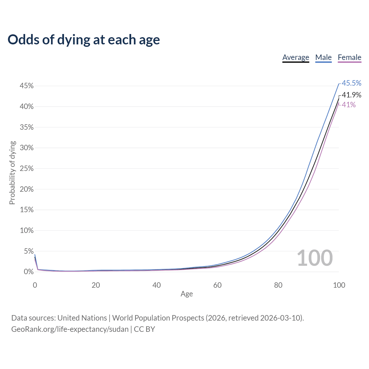 This life expectancy calculator shows the odds of living to 100, 95, 90, and below based on current age for both males and females in Sudan, along with mean and median age of death. The calculations are based on the 2026 life tables (actuarial tables) from the UN World Population Prospects.