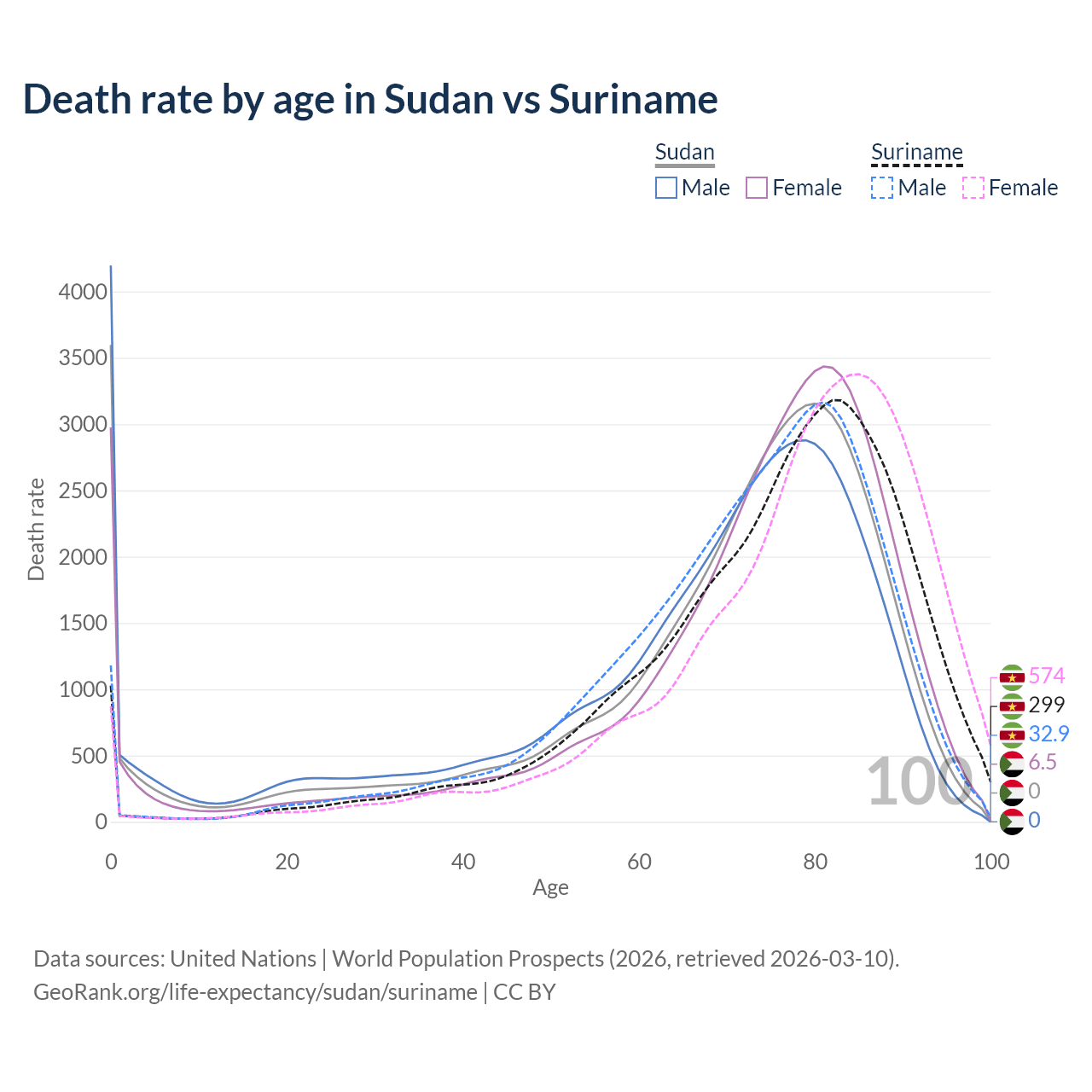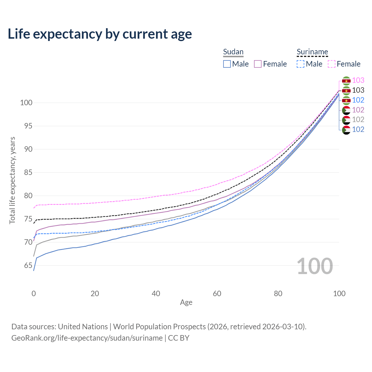 This life expectancy calculator shows the odds of living to 100, 95, 90, and below based on current age for both males and females in Sudan and Suriname, along with mean and median age of death. The calculations are based on the 2026 life tables (actuarial tables) from the UN World Population Prospects.