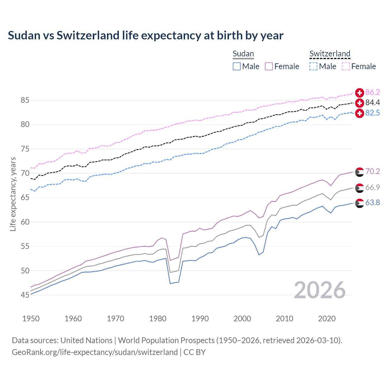 The average life expectancy at birth is 66.9 years in Sudan vs 84.4 in Switzerland. Sudan is ranked 160/197 by life expectancy, and Switzerland is 6/197. In Sudan, the life expectancy is 63.8 years for males and 70.2 years for females. In Switzerland, it's 82.5 years for males and 86.2 years for females.