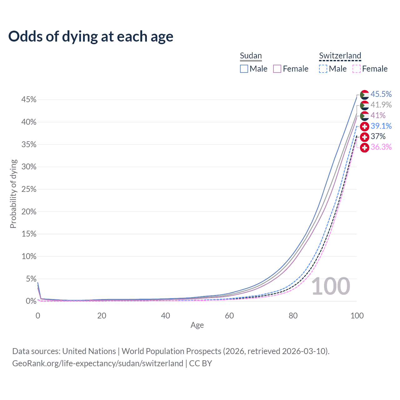 This life expectancy calculator shows the odds of living to 100, 95, 90, and below based on current age for both males and females in Sudan and Switzerland, along with mean and median age of death. The calculations are based on the 2026 life tables (actuarial tables) from the UN World Population Prospects.