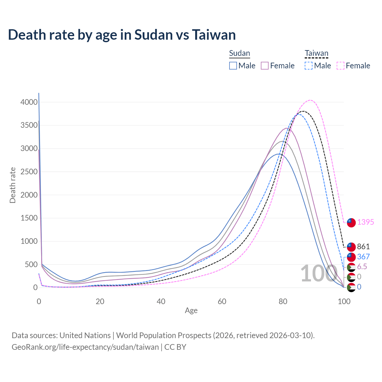 In Sudan, the most common age of death is 0, compared to 87 in Taiwan. The median age of death is 74.1 in Sudan and 84.3 in Taiwan, meaning only half of each cohort is expected to live past that age.