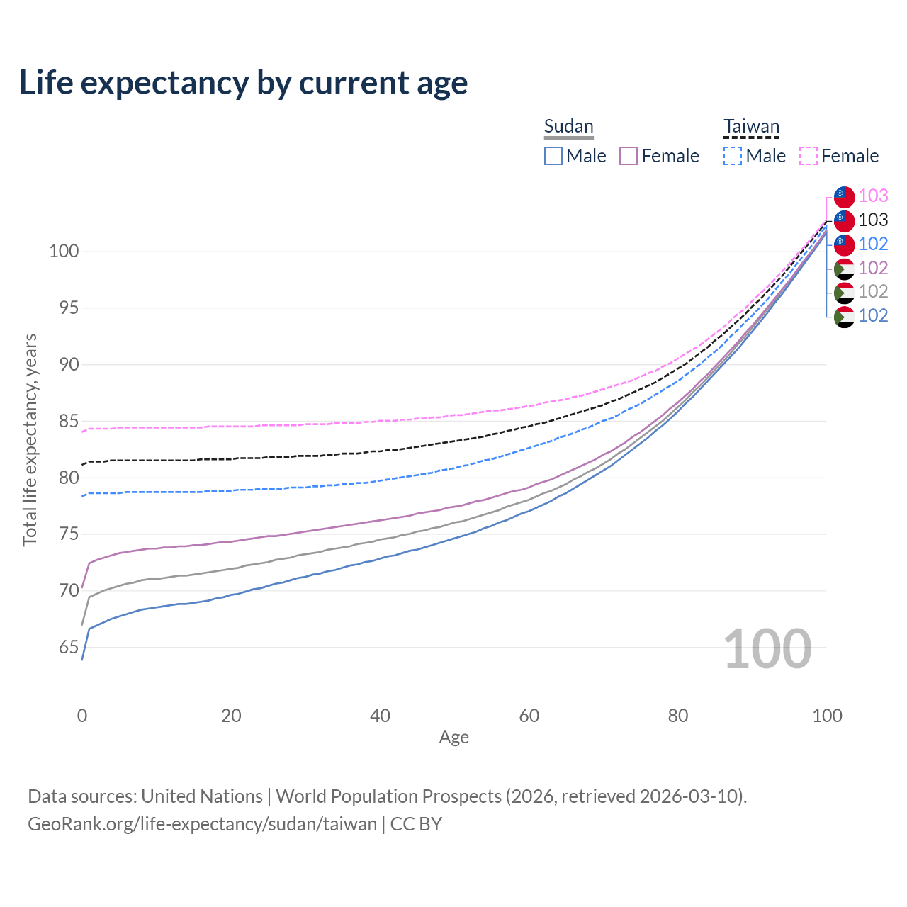 The average life expectancy at birth is 66.9 years in Sudan vs 81.1 in Taiwan. Sudan is ranked 160/197 by life expectancy, and Taiwan is 40/197. In Sudan, the life expectancy is 63.8 years for males and 70.2 years for females. In Taiwan, it's 78.3 years for males and 84 years for females.