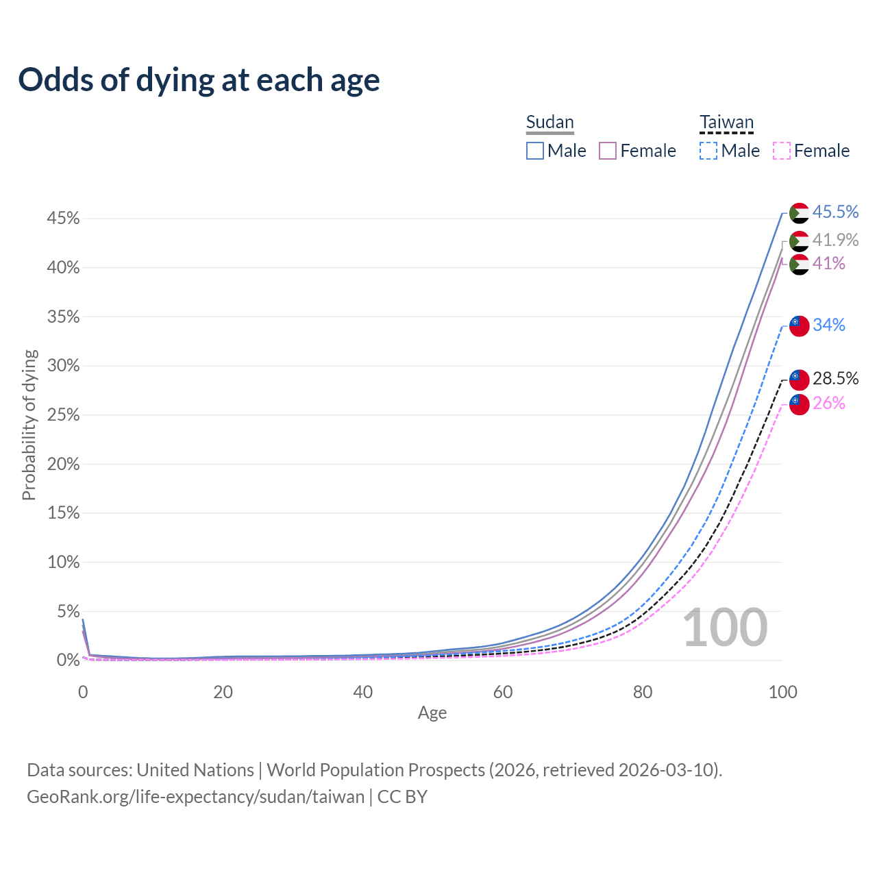 This life expectancy calculator shows the odds of living to 100, 95, 90, and below based on current age for both males and females in Sudan and Taiwan, along with mean and median age of death. The calculations are based on the 2026 life tables (actuarial tables) from the UN World Population Prospects.