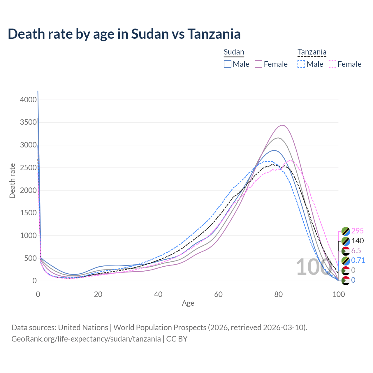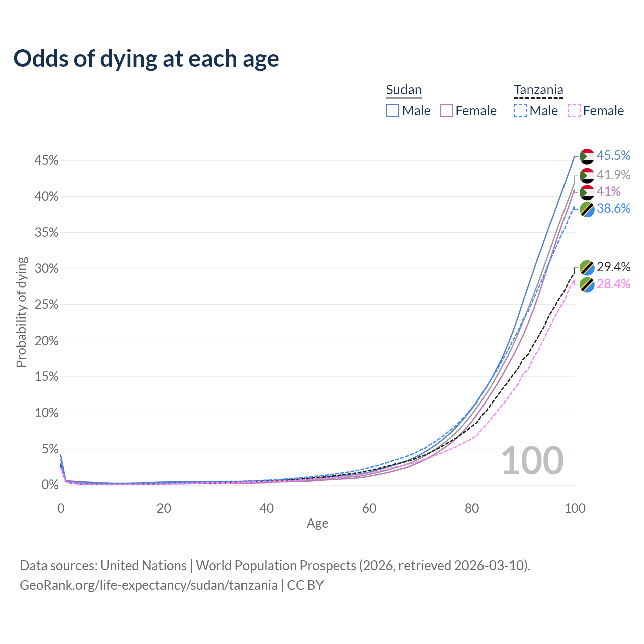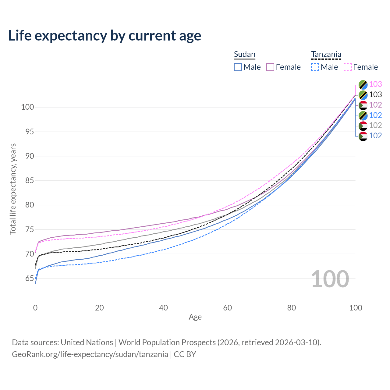 This life expectancy calculator shows the odds of living to 100, 95, 90, and below based on current age for both males and females in Sudan and Tanzania, along with mean and median age of death. The calculations are based on the 2026 life tables (actuarial tables) from the UN World Population Prospects.