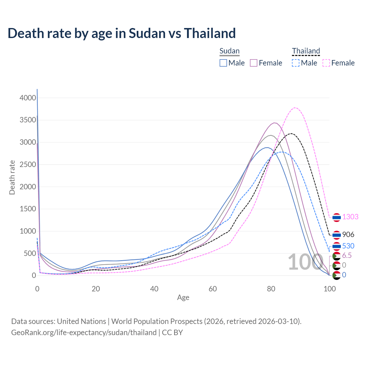In Sudan, the most common age of death is 0, compared to 87 in Thailand. The median age of death is 74.1 in Sudan and 81.8 in Thailand, meaning only half of each cohort is expected to live past that age.