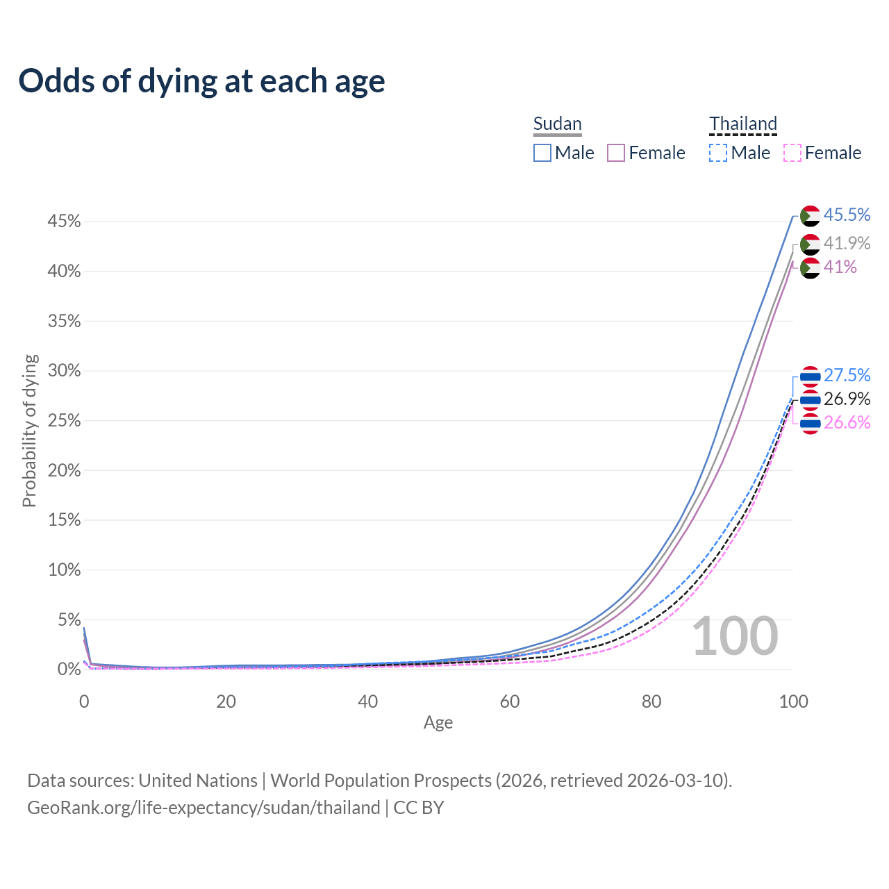 This life expectancy calculator shows the odds of living to 100, 95, 90, and below based on current age for both males and females in Sudan and Thailand, along with mean and median age of death. The calculations are based on the 2026 life tables (actuarial tables) from the UN World Population Prospects.