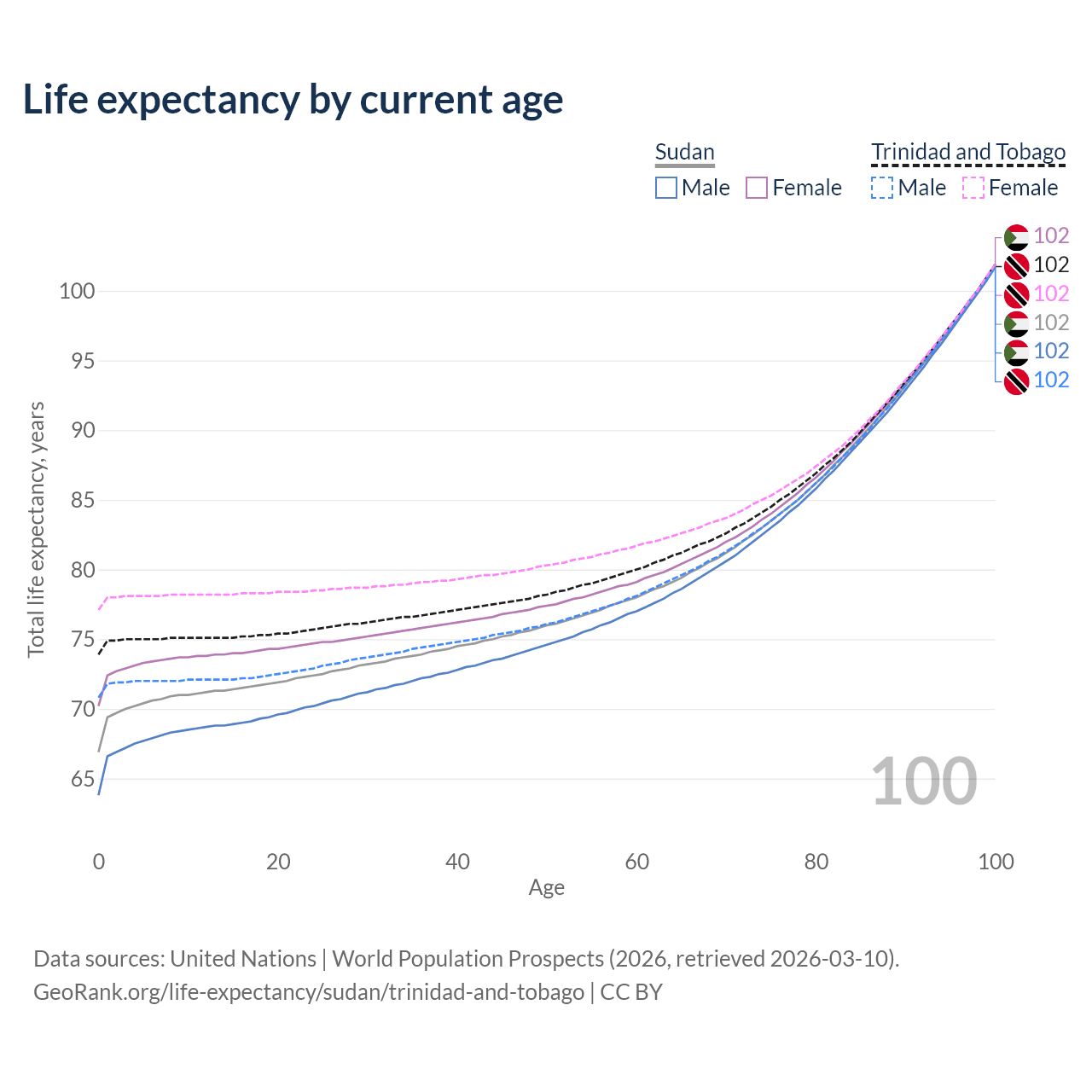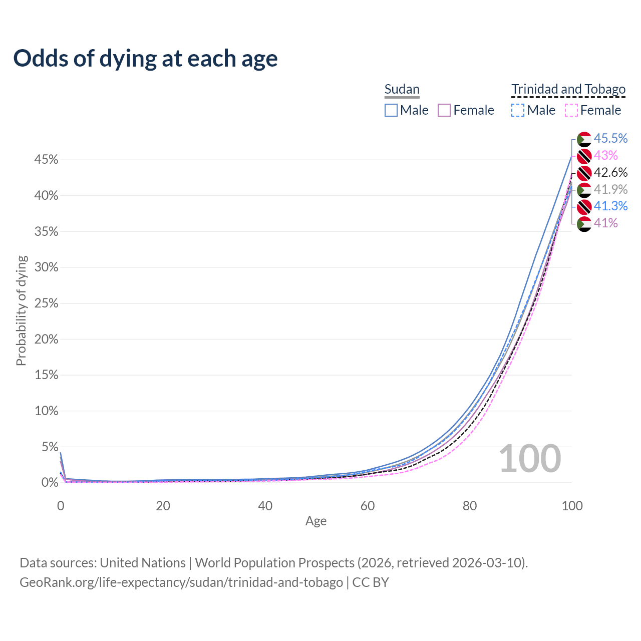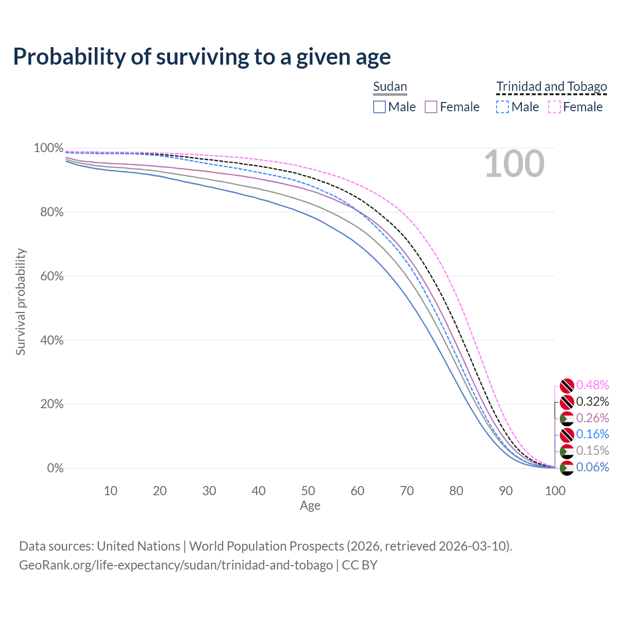 This life expectancy calculator shows the odds of living to 100, 95, 90, and below based on current age for both males and females in Sudan and Trinidad and Tobago, along with mean and median age of death. The calculations are based on the 2026 life tables (actuarial tables) from the UN World Population Prospects.