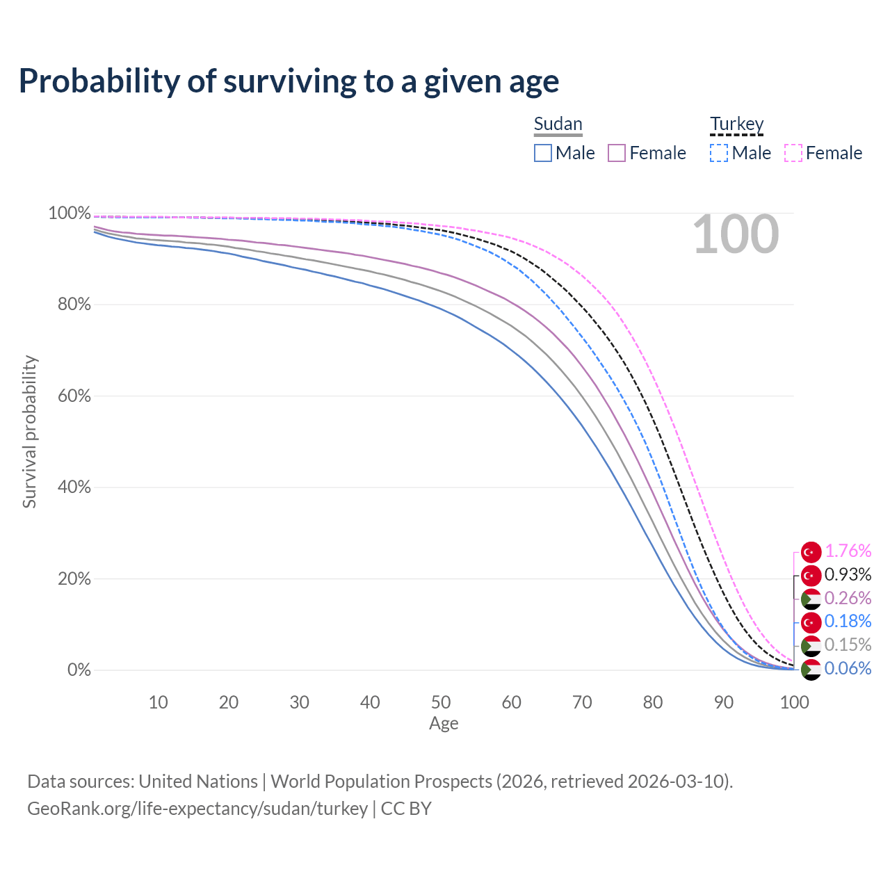 This life expectancy calculator shows the odds of living to 100, 95, 90, and below based on current age for both males and females in Sudan and Turkey, along with mean and median age of death. The calculations are based on the 2026 life tables (actuarial tables) from the UN World Population Prospects.