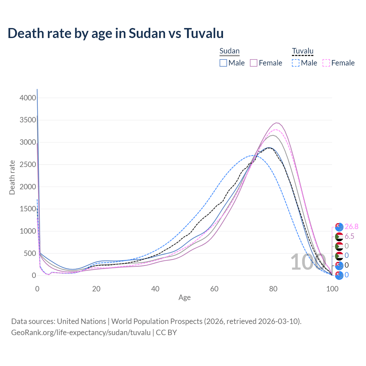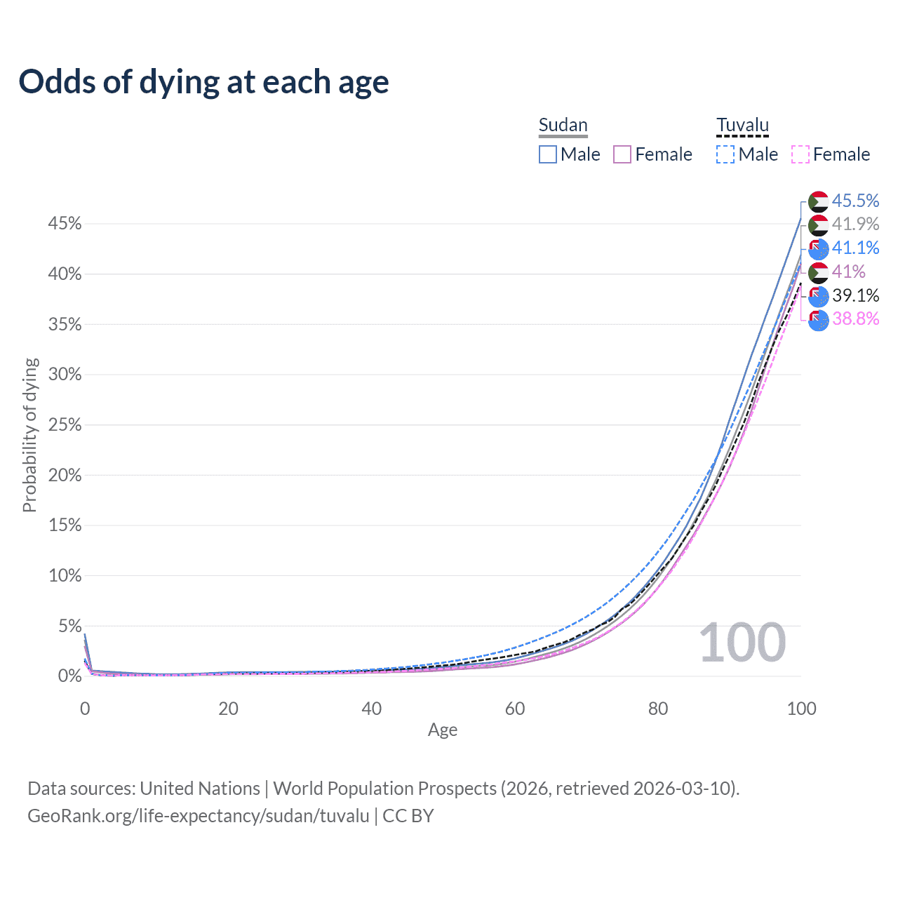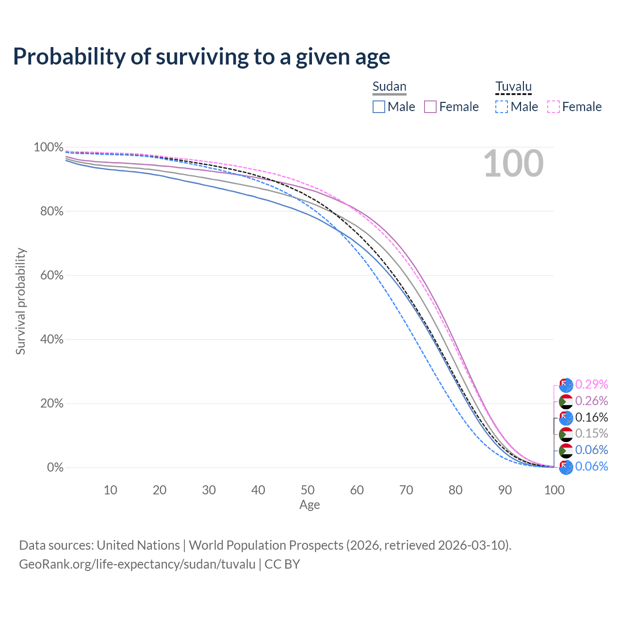 This life expectancy calculator shows the odds of living to 100, 95, 90, and below based on current age for both males and females in Sudan and Tuvalu, along with mean and median age of death. The calculations are based on the 2026 life tables (actuarial tables) from the UN World Population Prospects.