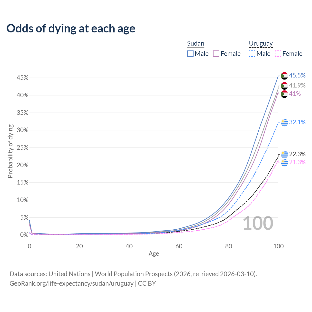 This life expectancy calculator shows the odds of living to 100, 95, 90, and below based on current age for both males and females in Sudan and Uruguay, along with mean and median age of death. The calculations are based on the 2026 life tables (actuarial tables) from the UN World Population Prospects.