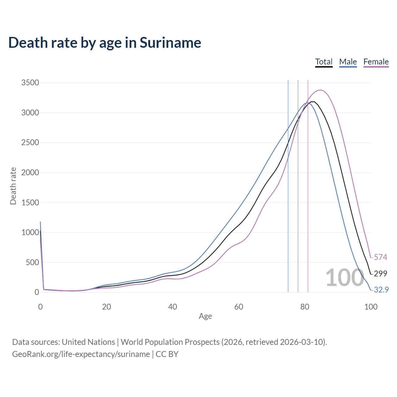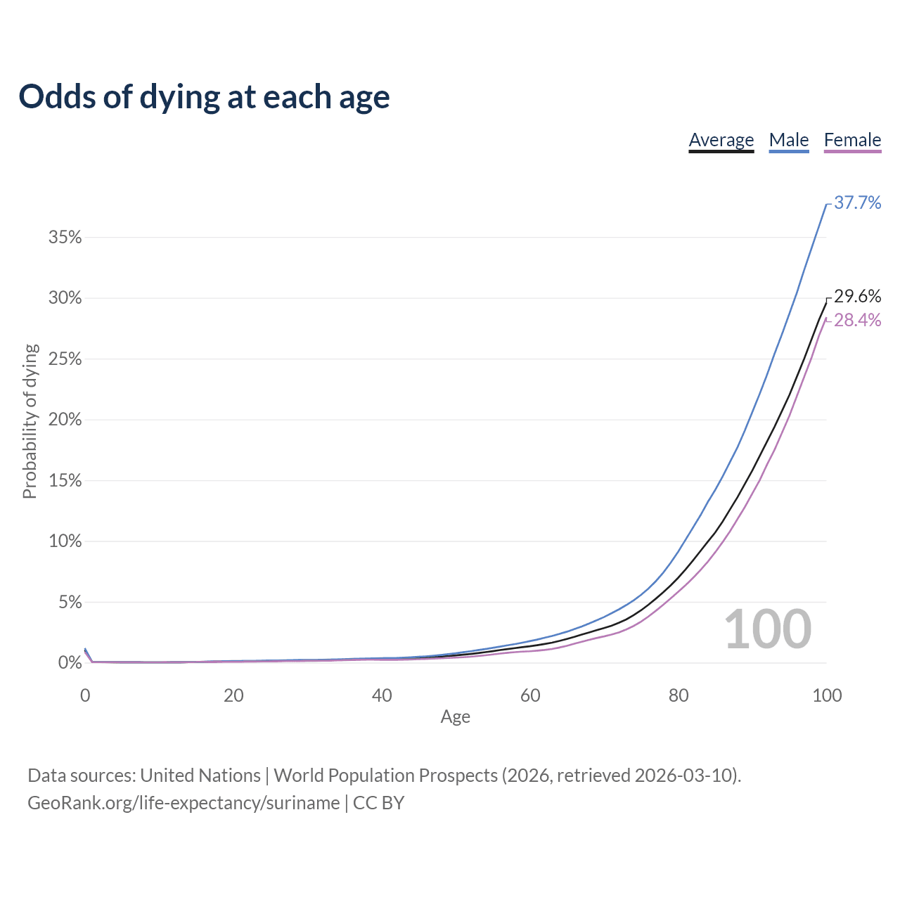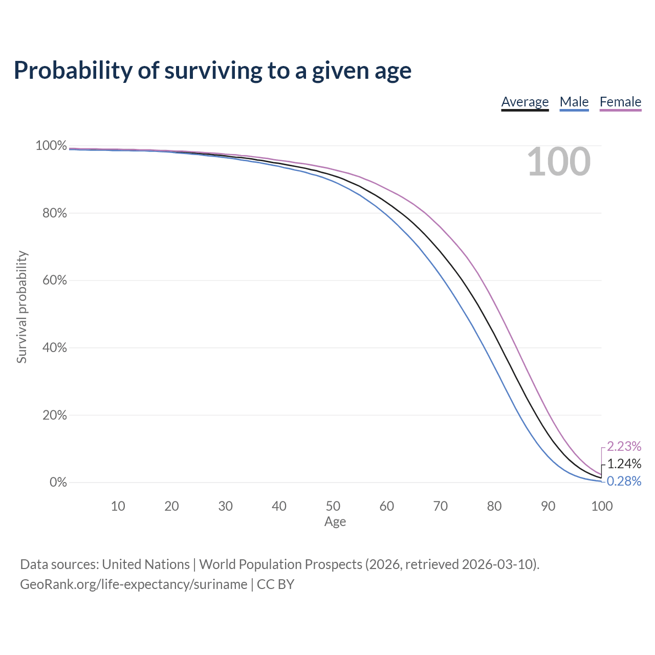 This life expectancy calculator shows the odds of living to 100, 95, 90, and below based on current age for both males and females in Suriname, along with mean and median age of death. The calculations are based on the 2026 life tables (actuarial tables) from the UN World Population Prospects.