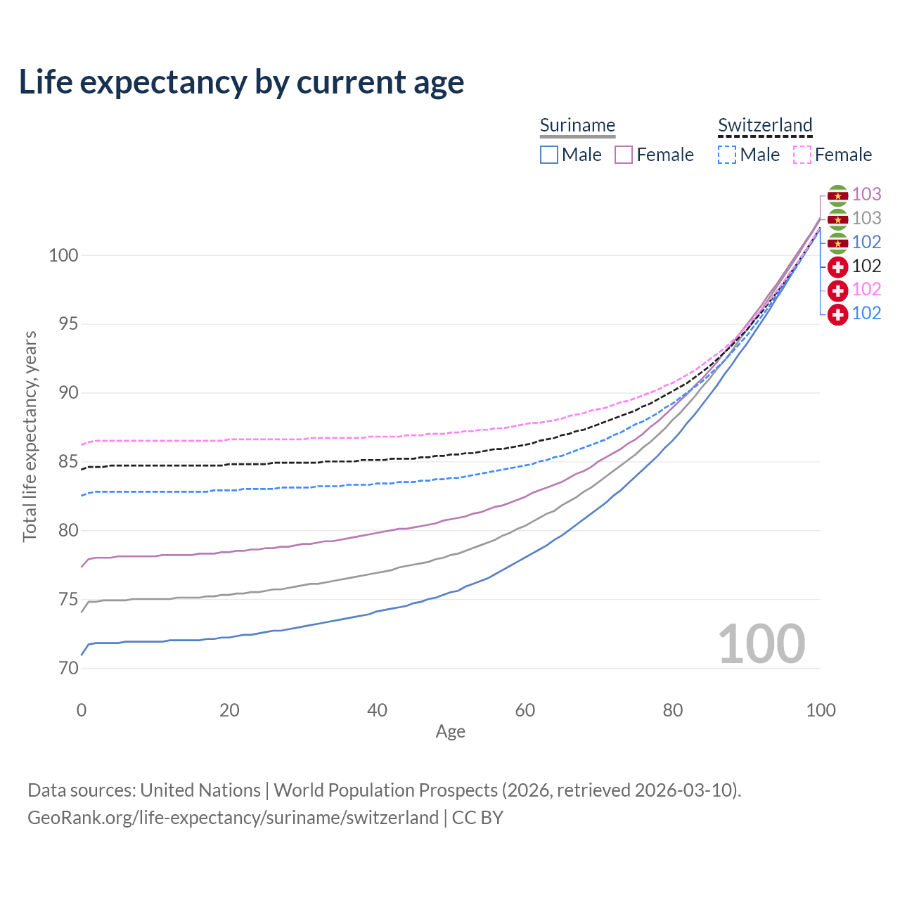 This life expectancy calculator shows the odds of living to 100, 95, 90, and below based on current age for both males and females in Suriname and Switzerland, along with mean and median age of death. The calculations are based on the 2026 life tables (actuarial tables) from the UN World Population Prospects.