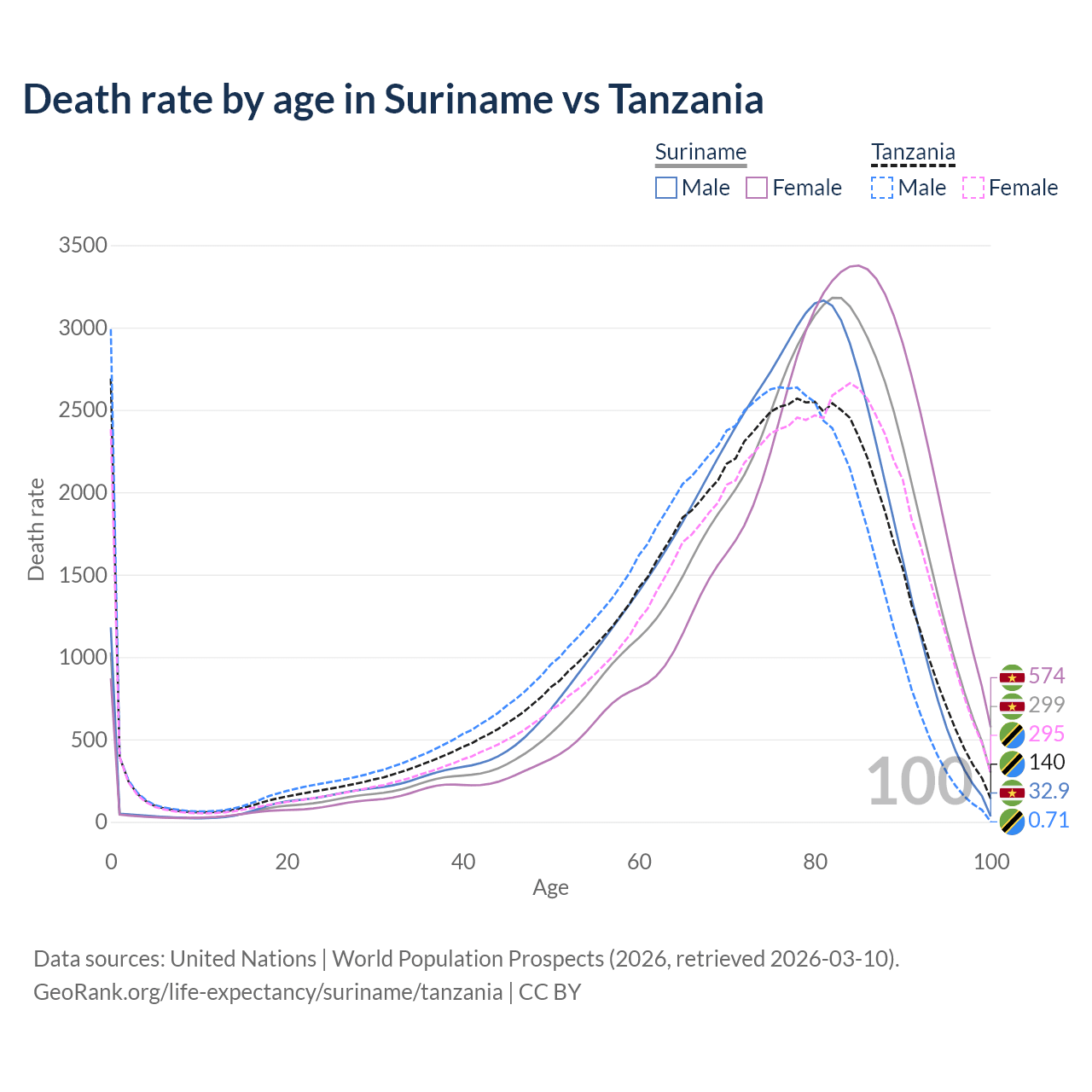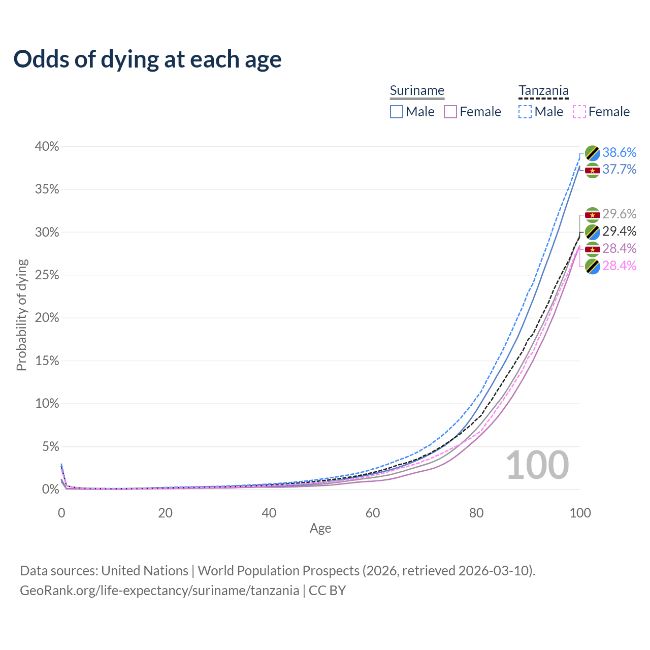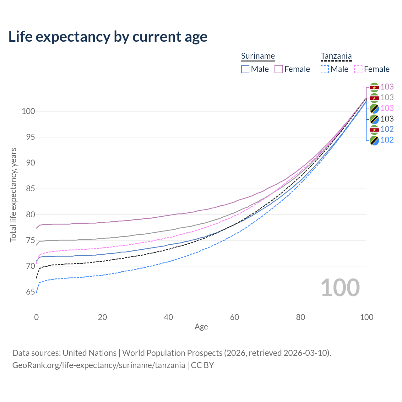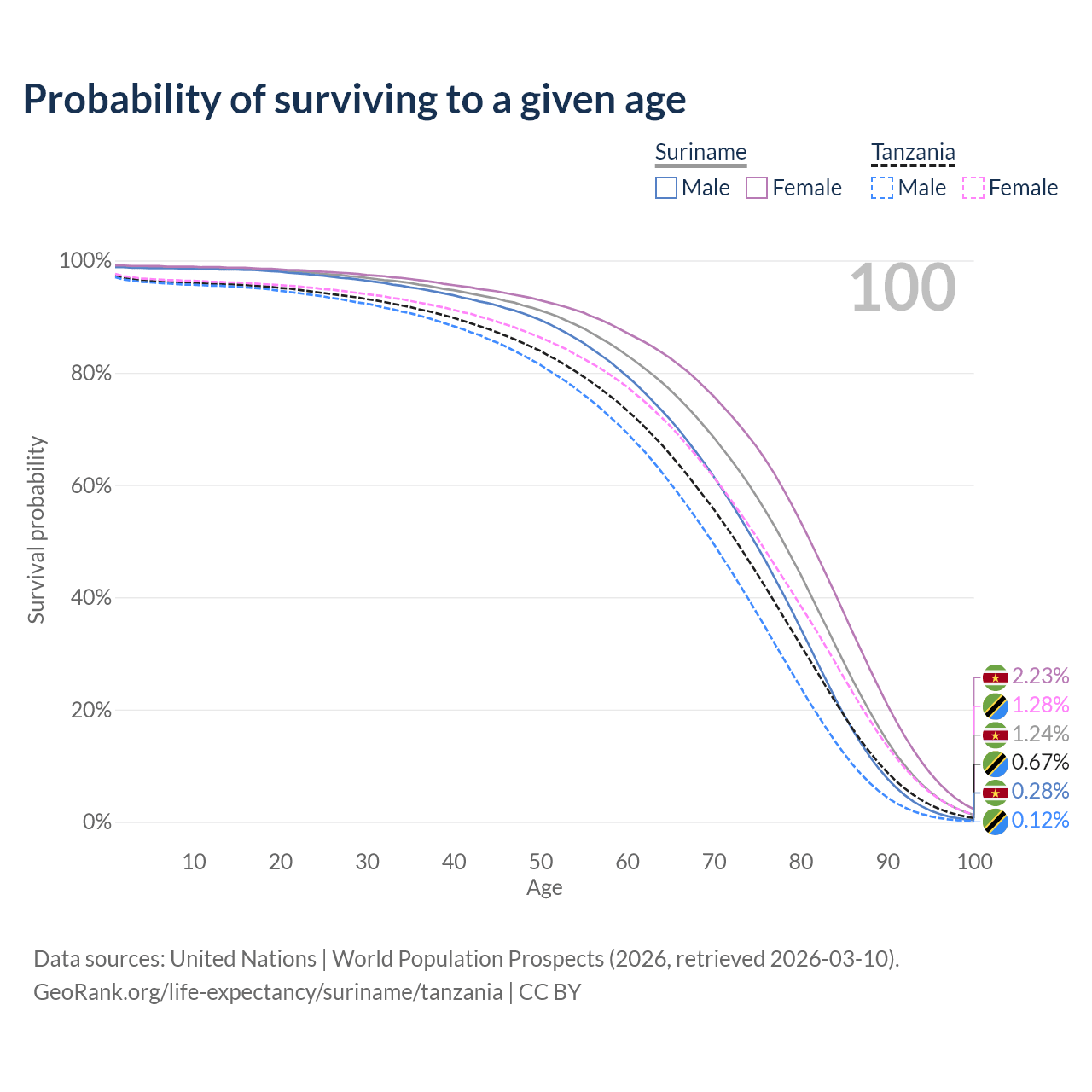 This life expectancy calculator shows the odds of living to 100, 95, 90, and below based on current age for both males and females in Suriname and Tanzania, along with mean and median age of death. The calculations are based on the 2026 life tables (actuarial tables) from the UN World Population Prospects.