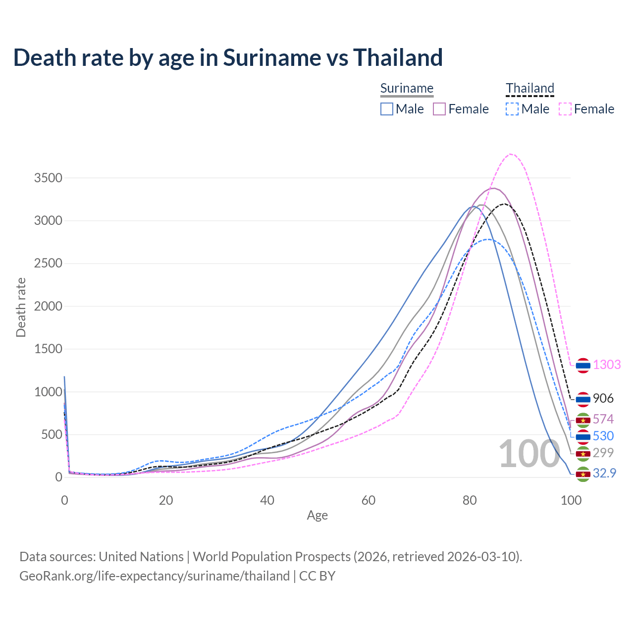 In Suriname, the most common age of death is 82, compared to 87 in Thailand. The median age of death is 78 in Suriname and 81.8 in Thailand, meaning only half of each cohort is expected to live past that age.