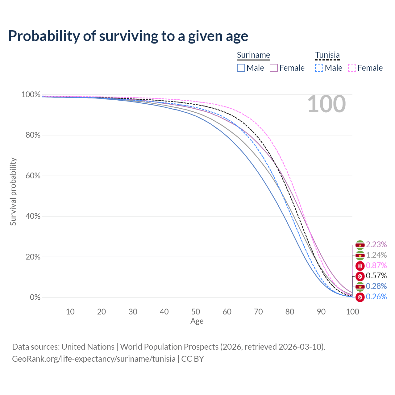 This life expectancy calculator shows the odds of living to 100, 95, 90, and below based on current age for both males and females in Suriname and Tunisia, along with mean and median age of death. The calculations are based on the 2026 life tables (actuarial tables) from the UN World Population Prospects.