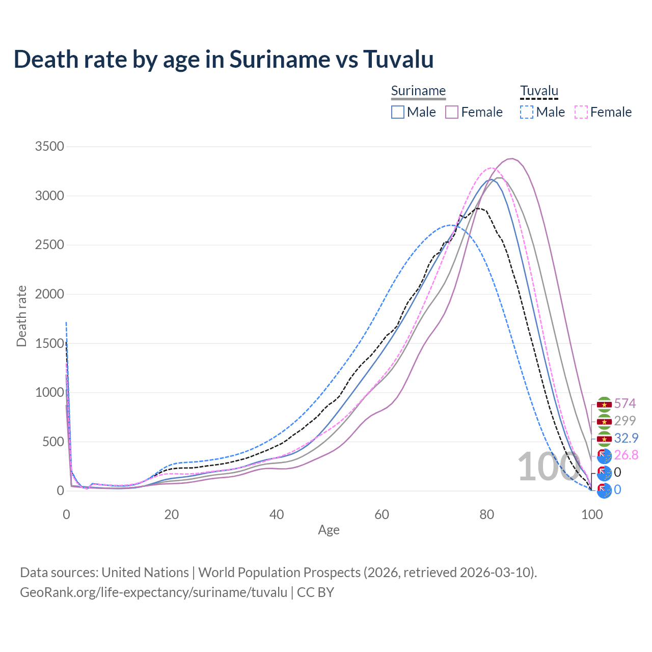 In Suriname, the most common age of death is 82, compared to 78 in Tuvalu. The median age of death is 78 in Suriname and 71.9 in Tuvalu, meaning only half of each cohort is expected to live past that age.