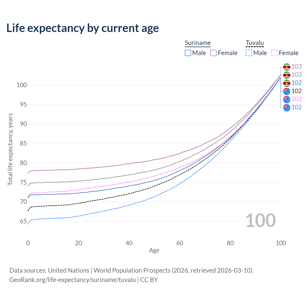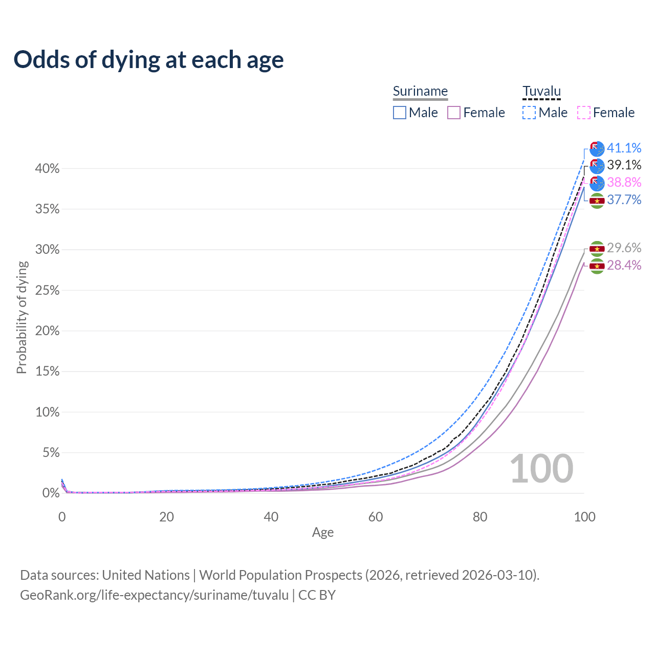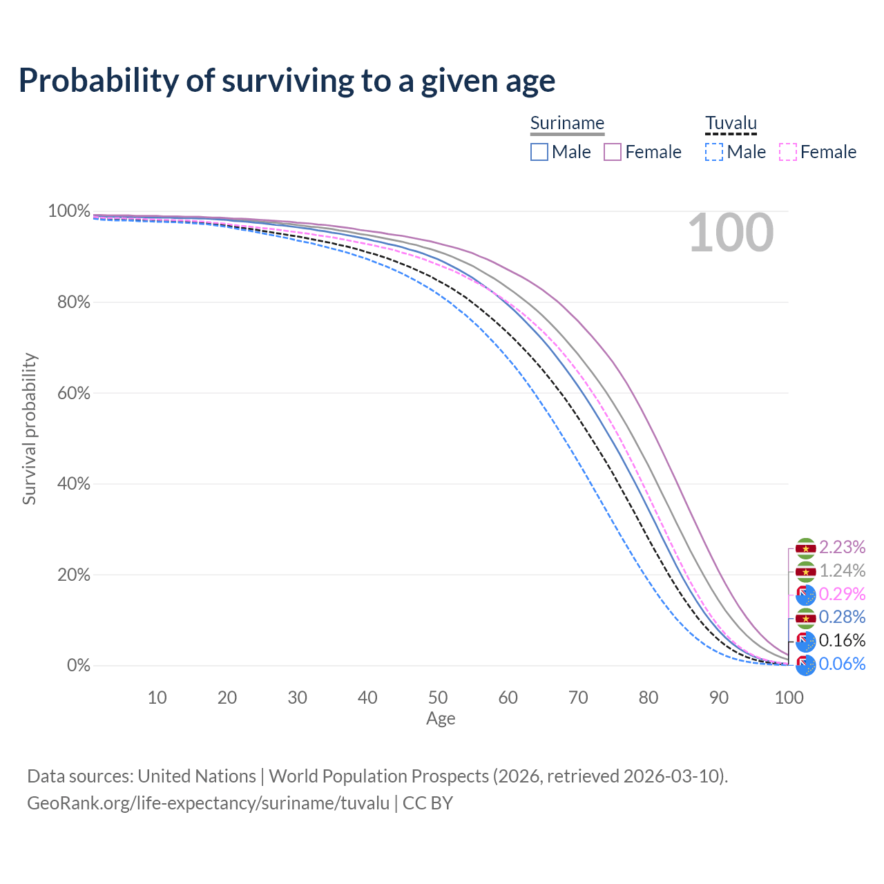 This life expectancy calculator shows the odds of living to 100, 95, 90, and below based on current age for both males and females in Suriname and Tuvalu, along with mean and median age of death. The calculations are based on the 2026 life tables (actuarial tables) from the UN World Population Prospects.