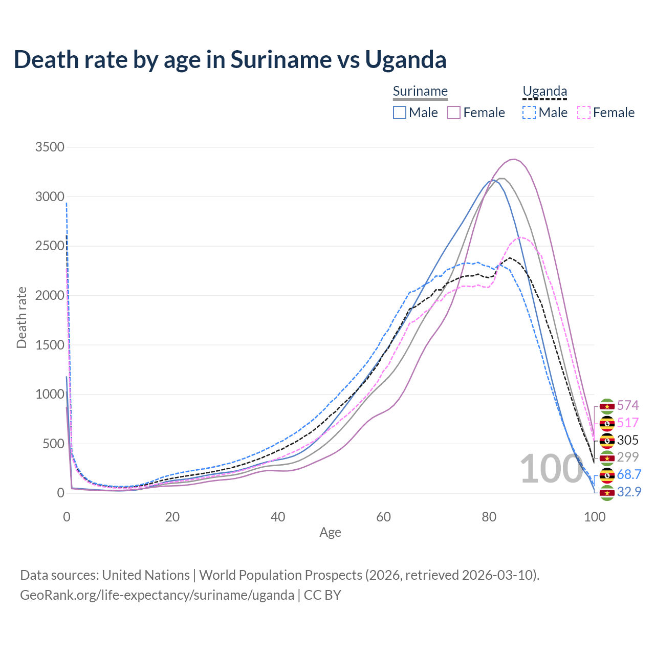 The average life expectancy at birth is 74 years in Suriname vs 68.9 in Uganda. Suriname is ranked 103/197 by life expectancy, and Uganda is 146/197. In Suriname, the life expectancy is 70.9 years for males and 77.3 years for females. In Uganda, it's 65.9 years for males and 71.8 years for females.