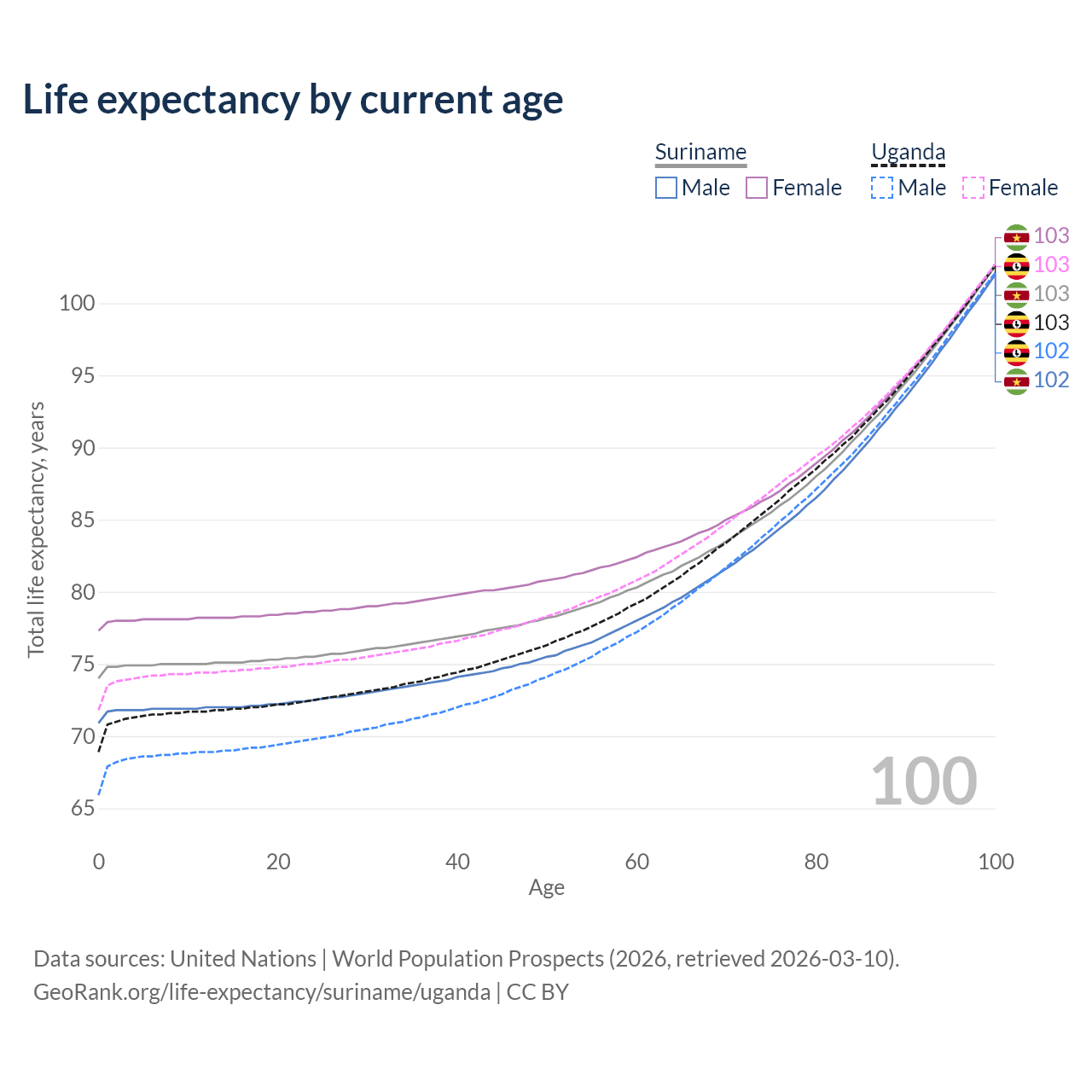 This life expectancy calculator shows the odds of living to 100, 95, 90, and below based on current age for both males and females in Suriname and Uganda, along with mean and median age of death. The calculations are based on the 2026 life tables (actuarial tables) from the UN World Population Prospects.